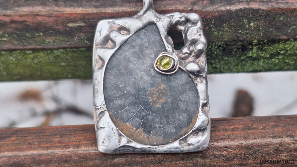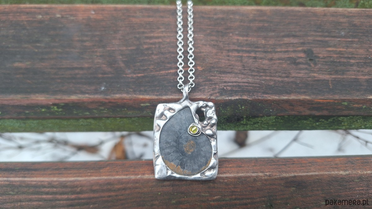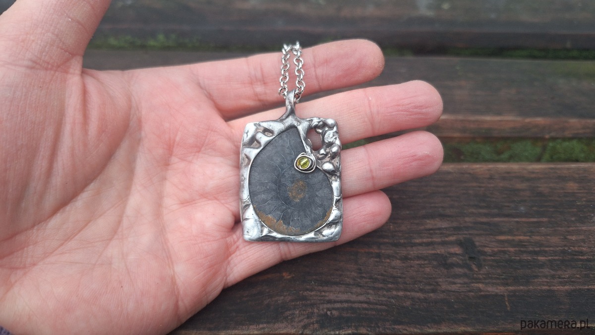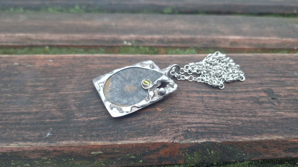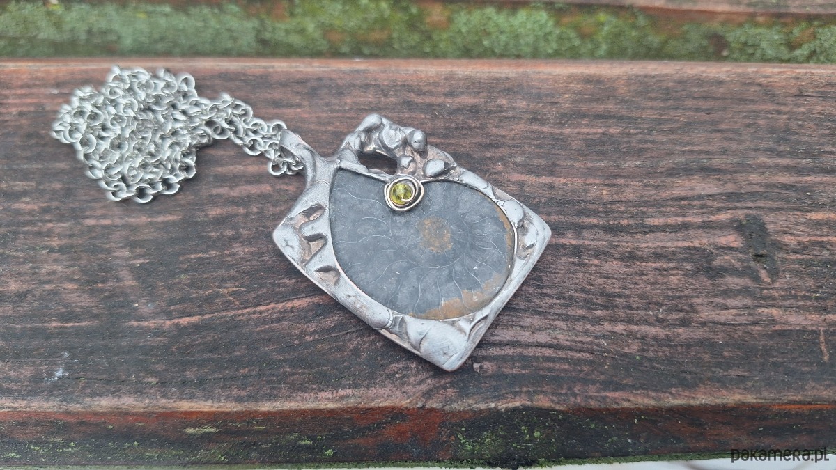 Wisiorek wykonany z miedzi, cyny, szkła i amonitu. Wymiary ok. 4 na 3 cm. Łańcuszek o długości ok. 50 cm.