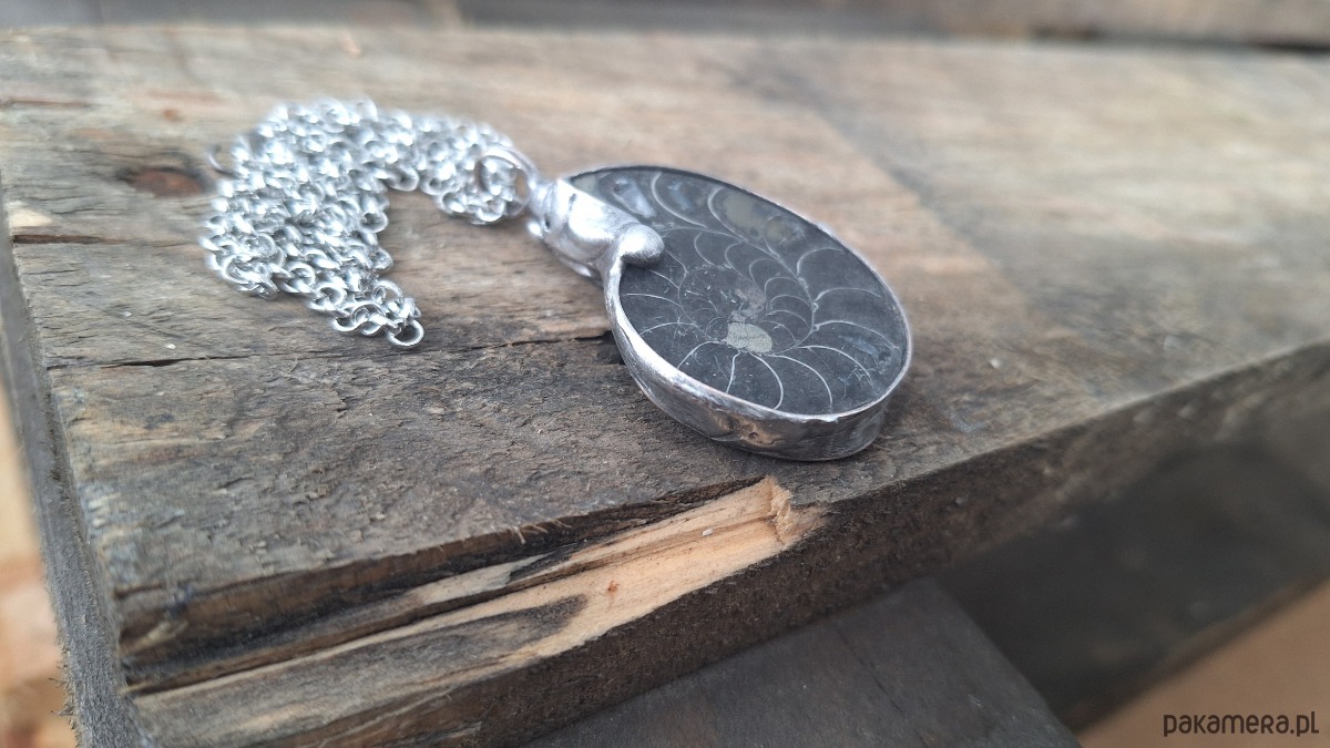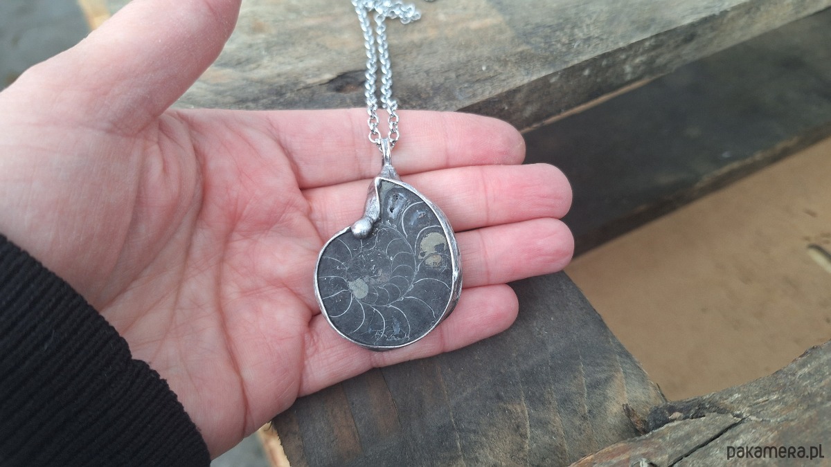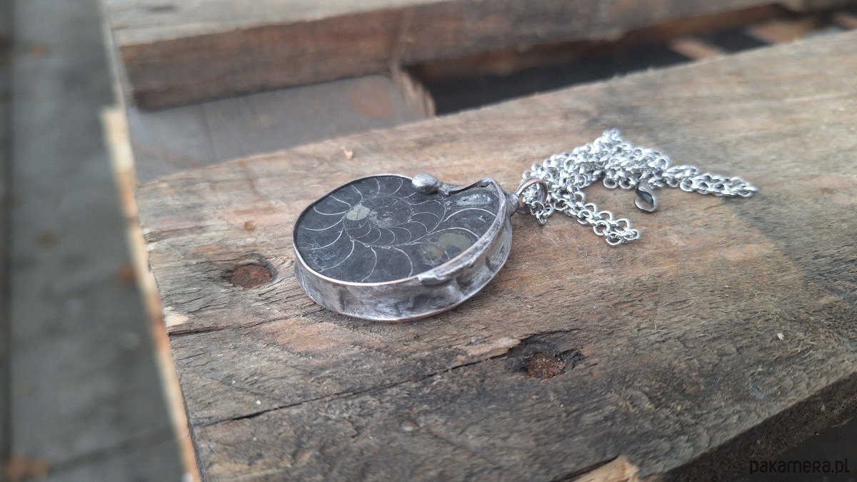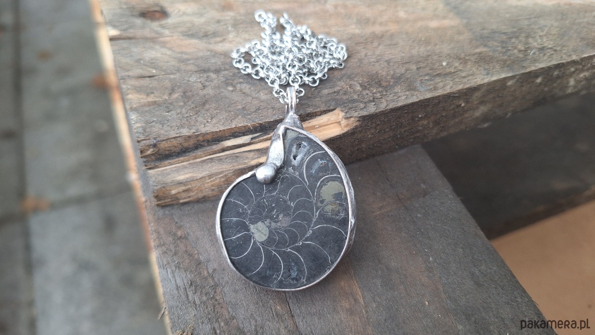 Wisiorek wykonany z miedzi, cyny i amonitu. Wymiary ok. 4.5 na 3.5 cm. Łańcuszek o długości ok. 50 cm.