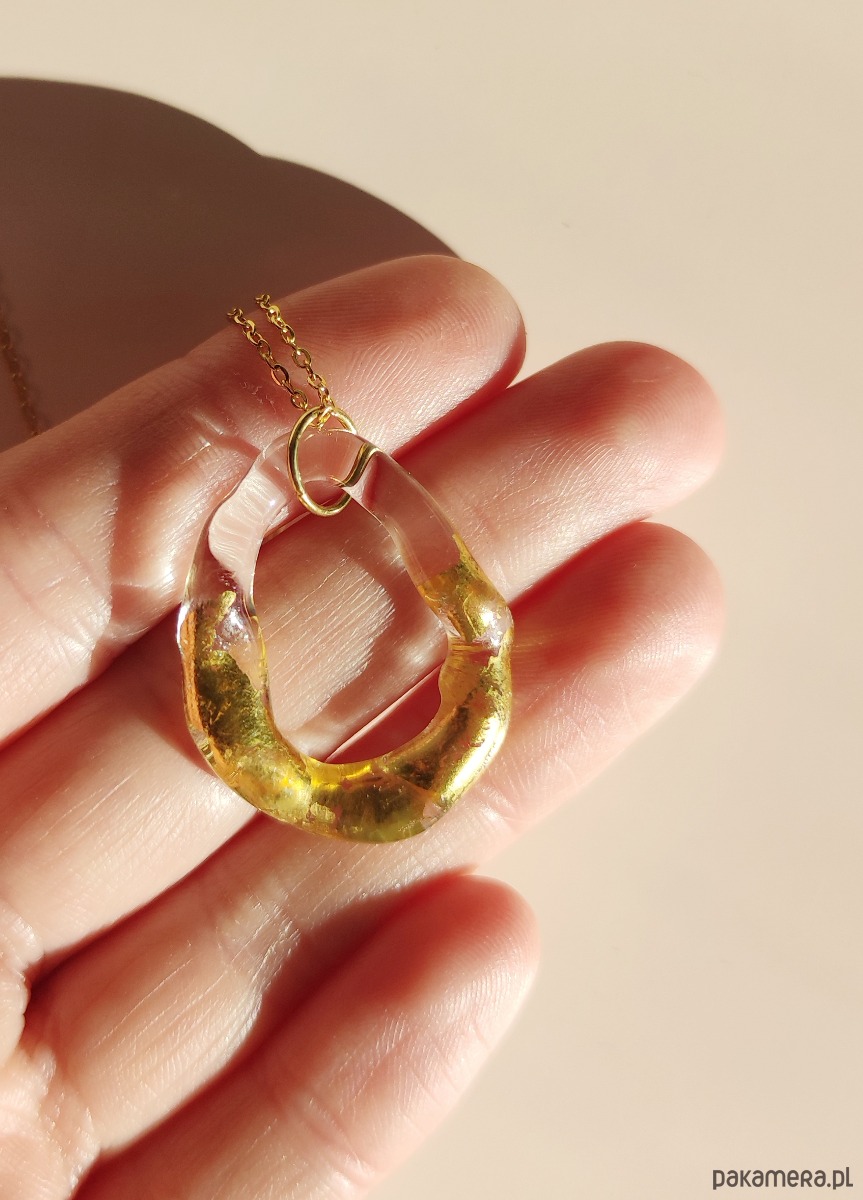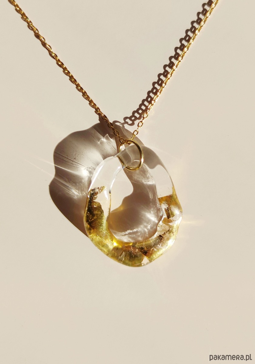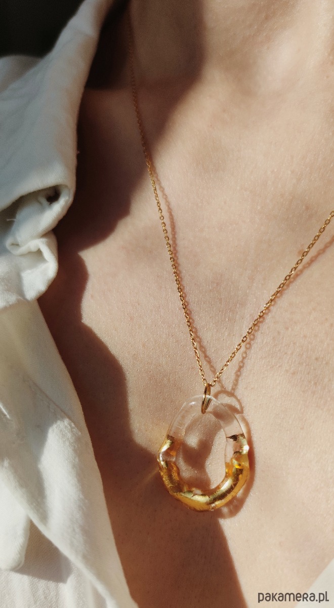Kolekcja Amorphic to biżuteria wyjątkowa jak każda z nas. Nieoczywista forma naszyjnika zamknięta jest w świetlistej materii szkła. Wykonany w płomieniu palnika wisior o nieregularnym kształcie pokrywany jest złotem płatkowym 23 i 3/4 karata. To wyjątkowa propozycja dla fanek minimalizmu i ponadczasowej elegancji.