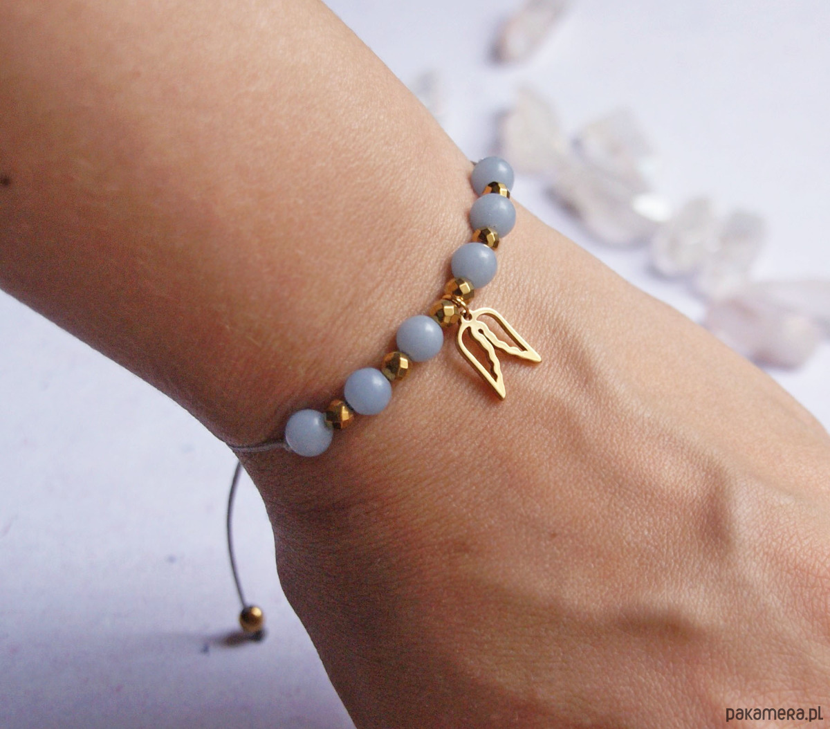 ...ANGELIT (Anhydryt) – to kamień anielski, magiczny, “duchowy opiekun”. Wytwarza ochronne pole energetyczne, uspakaja, wprowadza harmonię. To kamień uzdrowienia – ciała oraz relacji. Wspomaga w trudnościach z komunikacją z innym. Dobrze jest go nosić przy sobie. Pomocny w medytacji. Angelit nie powinien mieć kontaktu z wodą! Zdejmuj swoją bransoletkę przed kąpielą. Trzymaj w suchym miejscu.