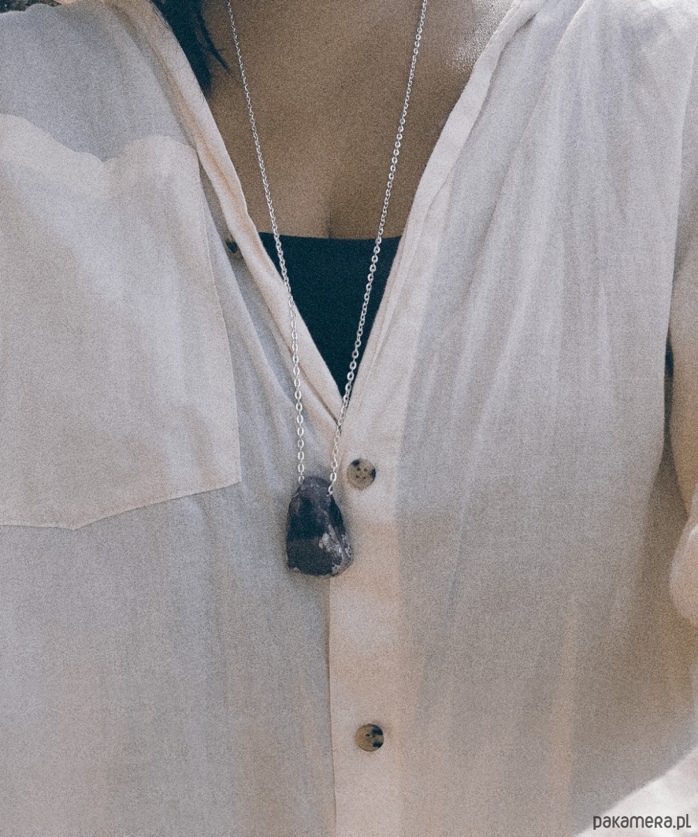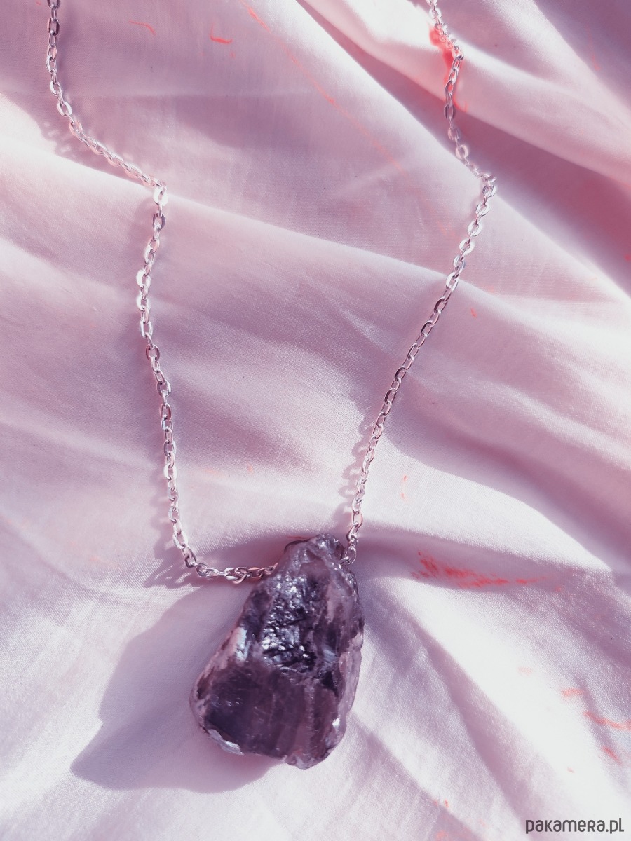 Duża bryłka ametystu muśnięta ekologiczną farbą w kolorze srebrnym, w towarzystwie długiego łańcuszka, to błysk oraz #goodvibesonly i dyskretny urok dla współczesnej Wiedźmy.