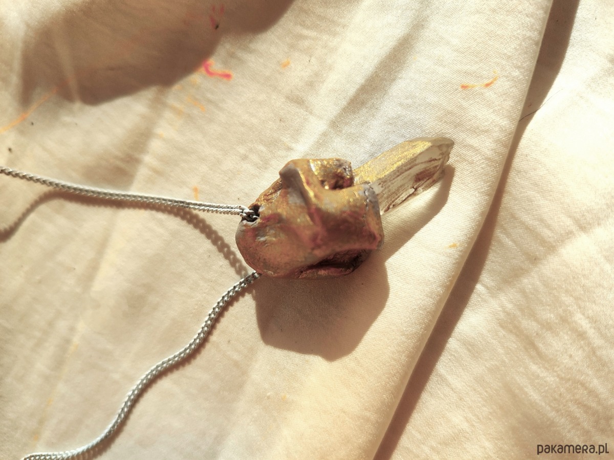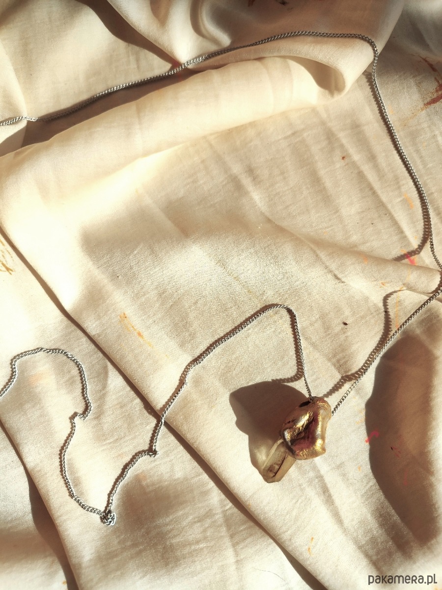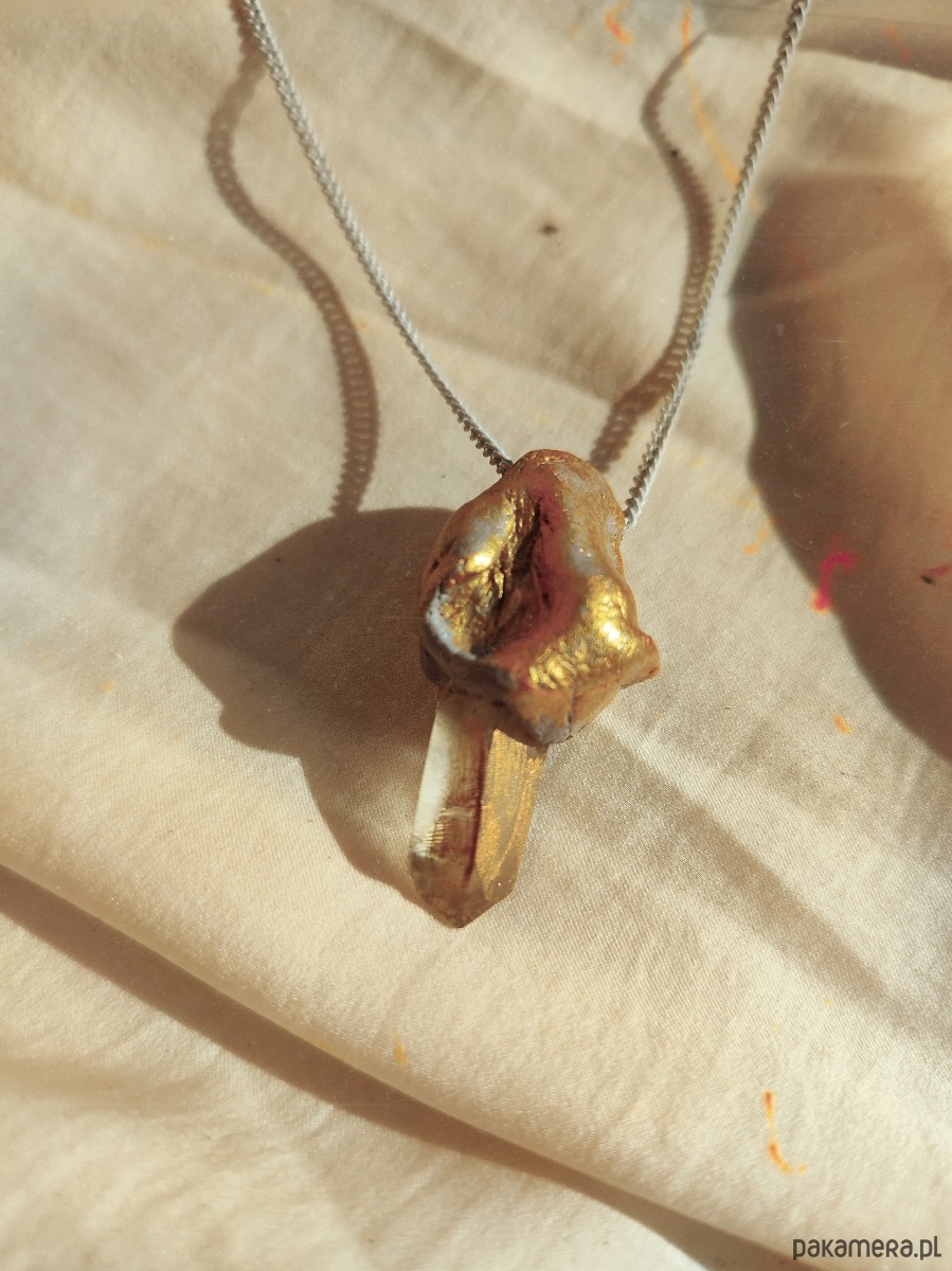 Bryłka kryształu górskiego zatopiona w glinie, w towarzystwie długiego (sięgającego okolic pępka) platerowanego łańcuszka. Błysk oraz #goodvibesonly i dyskretny urok dla współczesnej Wiedźmy.