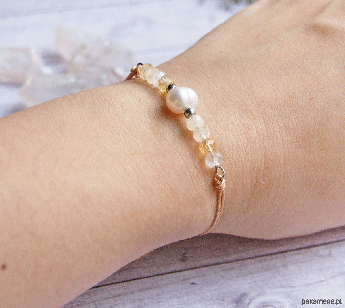 wykończenie (przesuwne) : regulacja za pomocą plecionki makramowej. drucik możesz sama delikatnie dogiąć tak, aby jak najlepiej dopasować bransoletkę do kształtu Twojego nadgarstka.