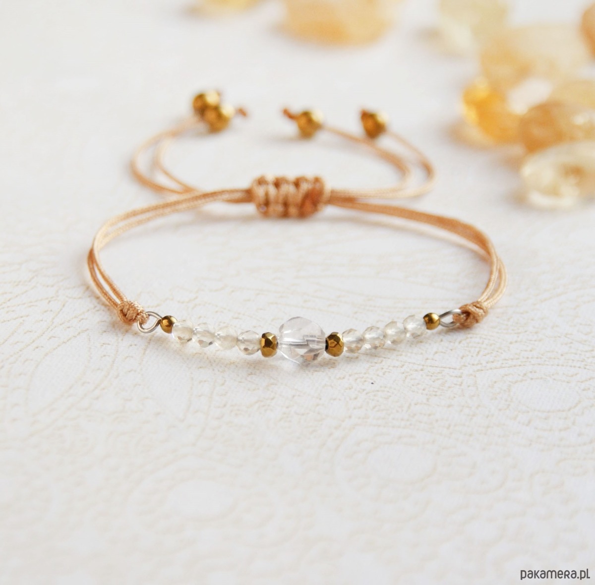 fasetowany kryształ górski (ok.6mm), fasetowane kuleczki cytrynu (3mm), złoty hematyt (przekładki).