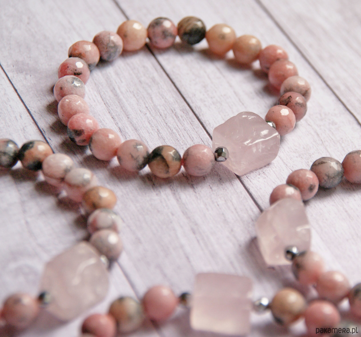 wykonana z kul wielobarwnego jadeitu rodonitowego (8mm) oraz sporej, nieregularnej, nieidealnej bryłki kwarcu różowego (ok.14x11x10mm) umieszczonej pomiędzy dwoma kuleczkami fasetowanego hematytu.