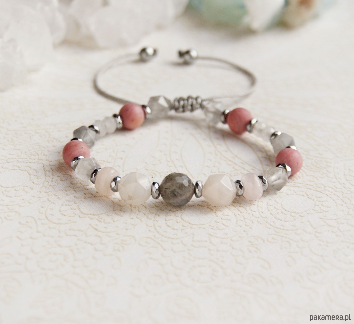 - Rodzaj kamienia: hematyt, kwarc różowy, labradoryt