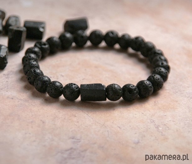 wykonana z czarnego turmalinu (bryłka surowa,ciosana) oraz porowatej lawy wulkanicznej (8mm)