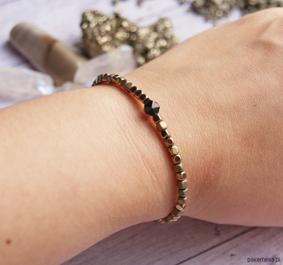 - hematyt w ciekawej formie - zaokrąglone kosteczki 3mm mat-błysk. kolor: stonowane złoto