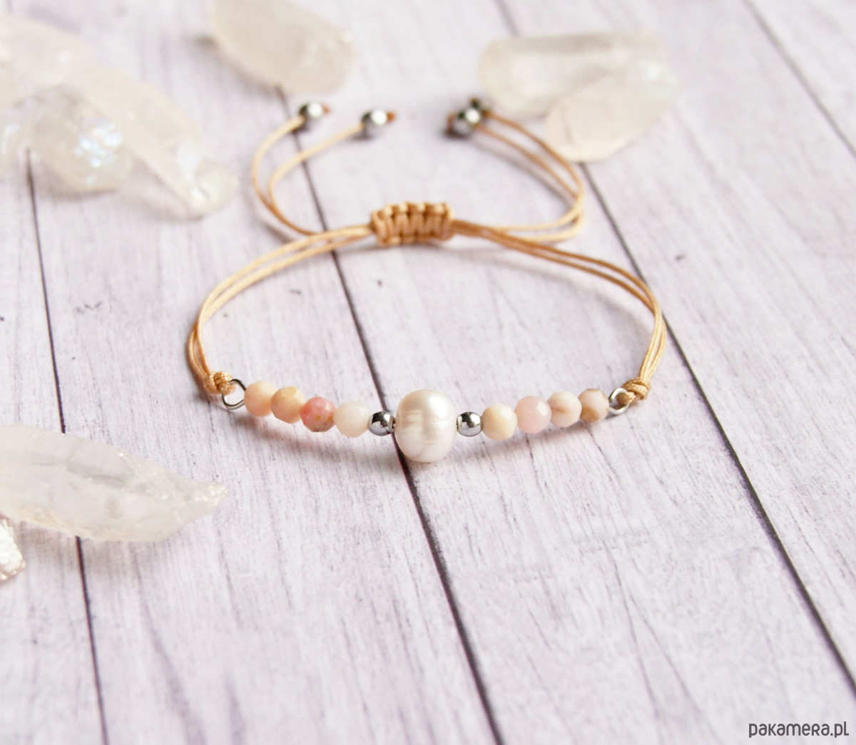 wykończenie (przesuwne) : regulacja za pomocą plecionki makramowej. drucik możesz sama delikatnie dogiąć tak, aby jak najlepiej dopasować bransoletkę do kształtu Twojego nadgarstka.