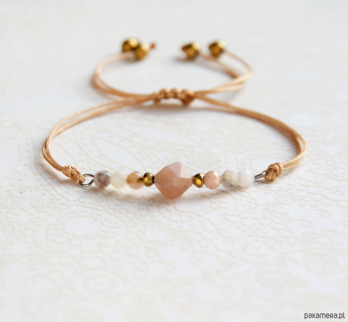 wykończenie (przesuwne) : regulacja za pomocą plecionki makramowej. drucik możesz sama delikatnie dogiąć tak, aby jak najlepiej dopasować bransoletkę do kształtu Twojego nadgarstka.