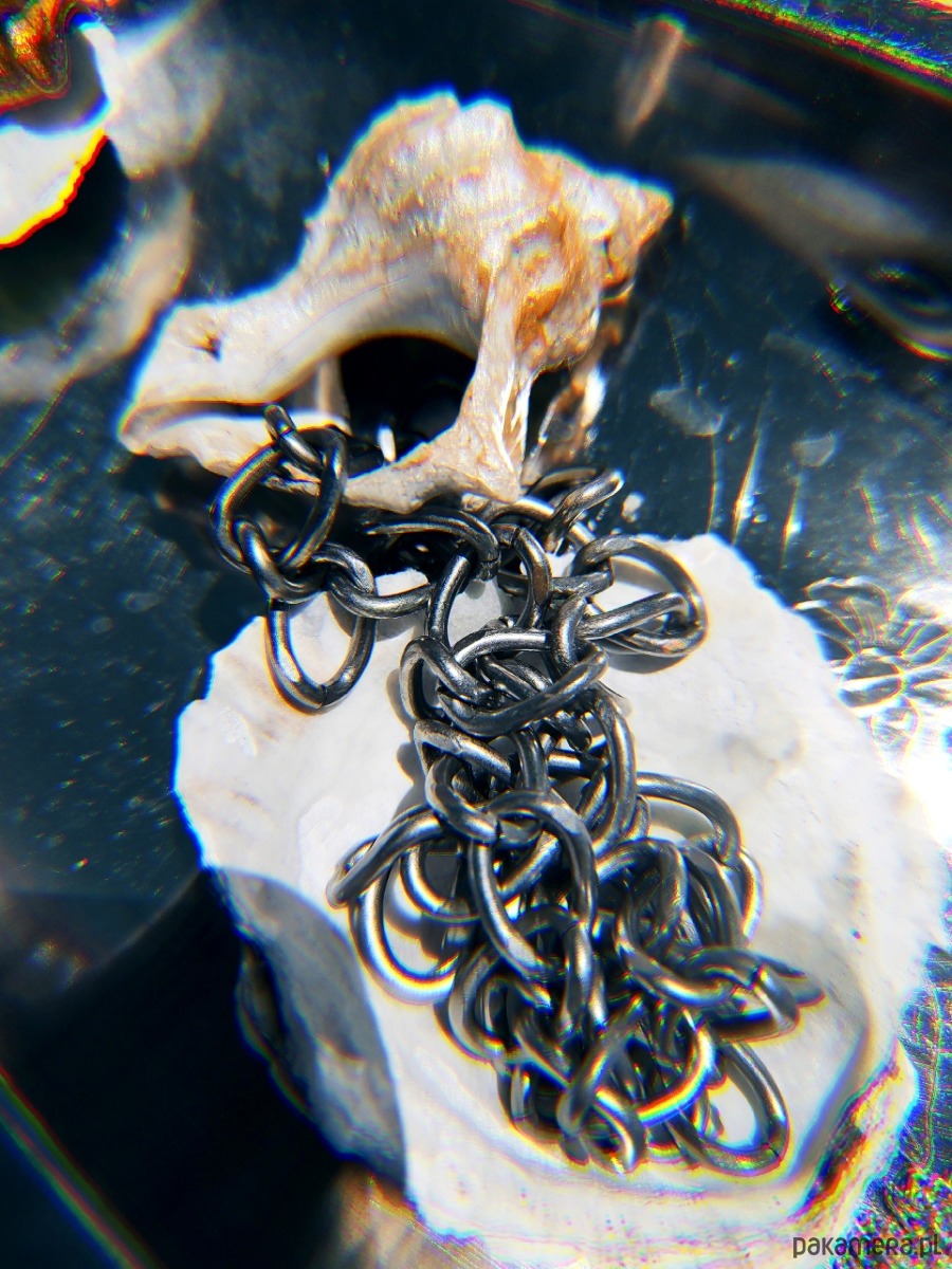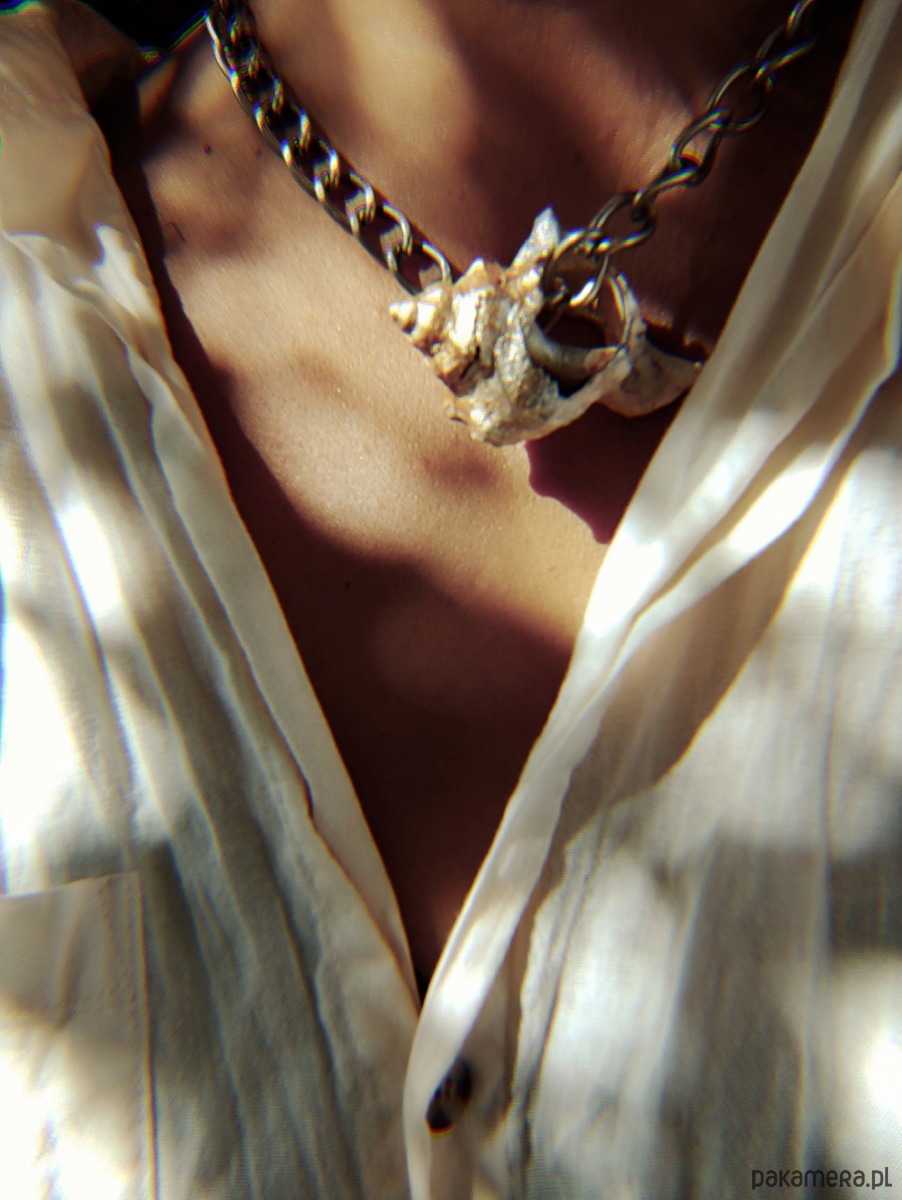 Duża muszla muśnięta lśnieniem, prosto znad Adriatyku, na konkretnym łańcuchu.