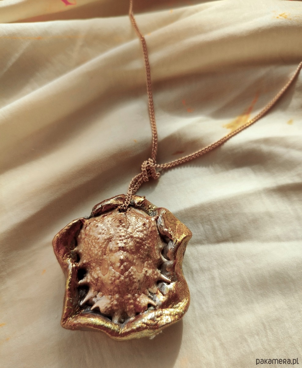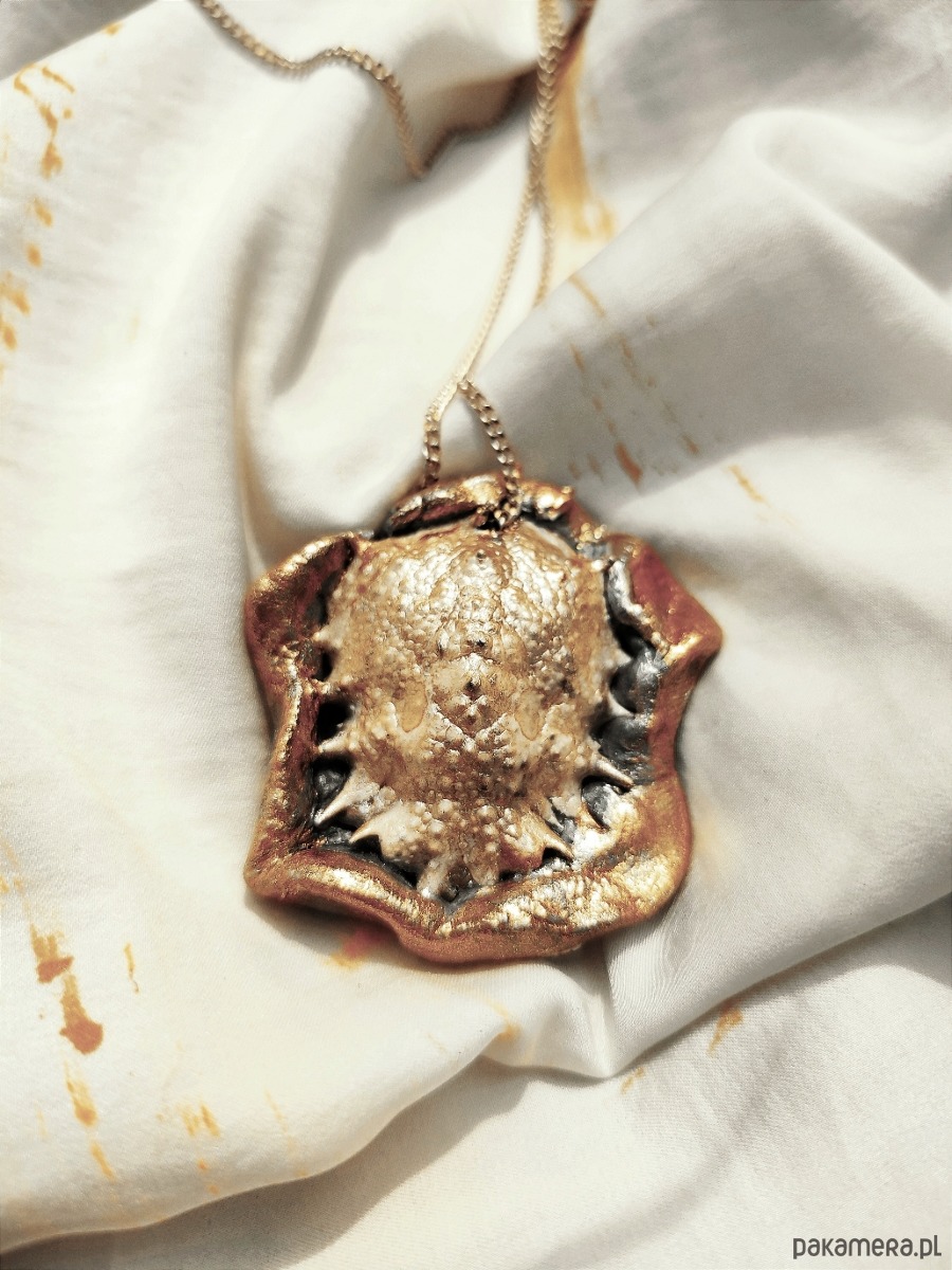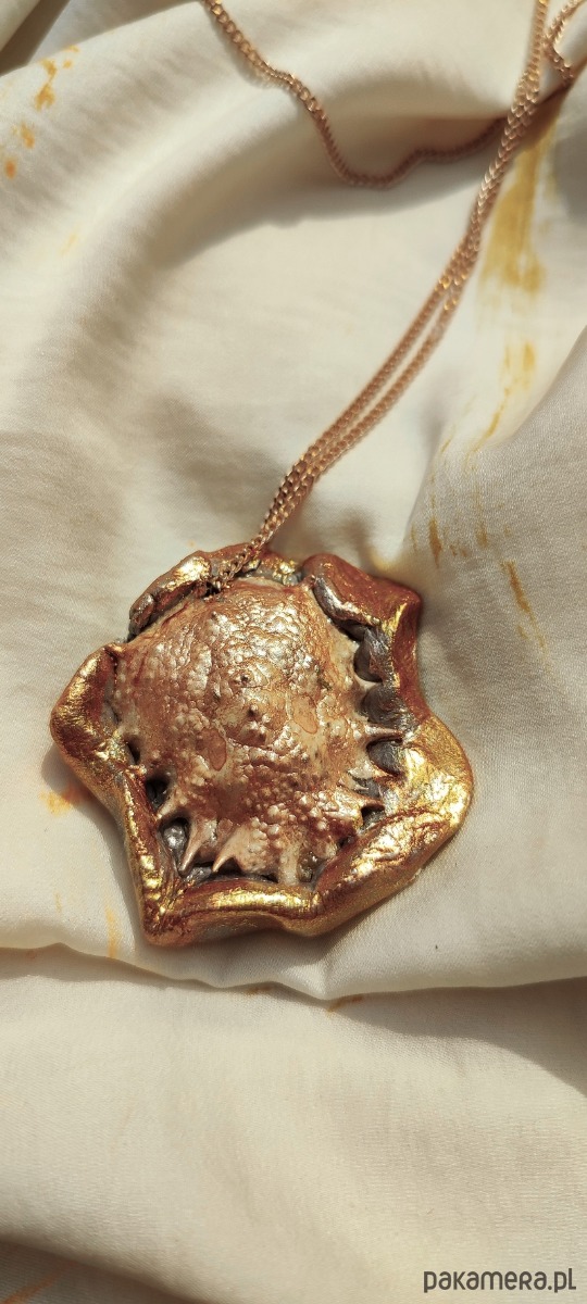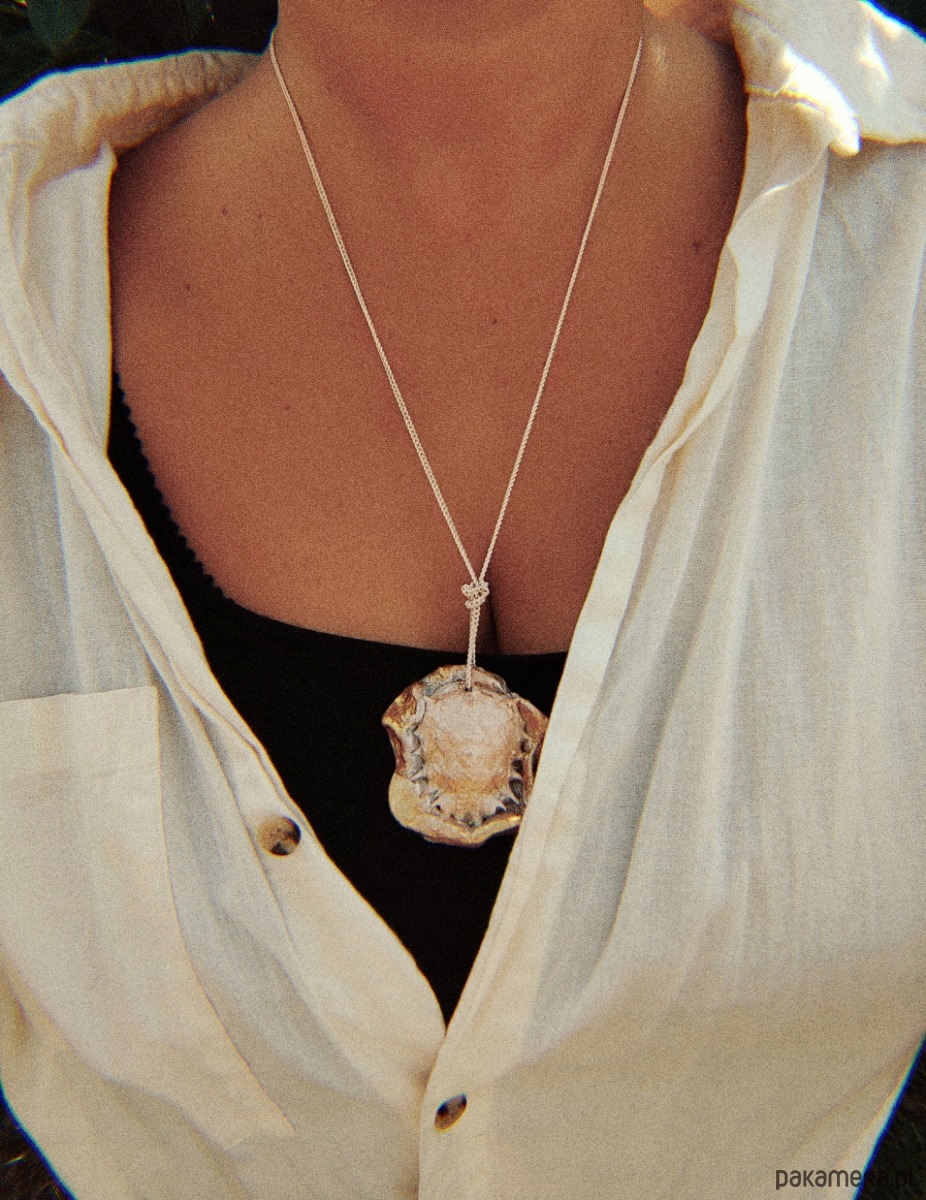 Pancerz zrzucony przez morskiego skorupiaka, muśnięty lśnieniem i zatopiony w szarej glinie, prosto znad Adriatyku, na platerowanym łańcuszku. Absolutnie fascynujący kształt.
