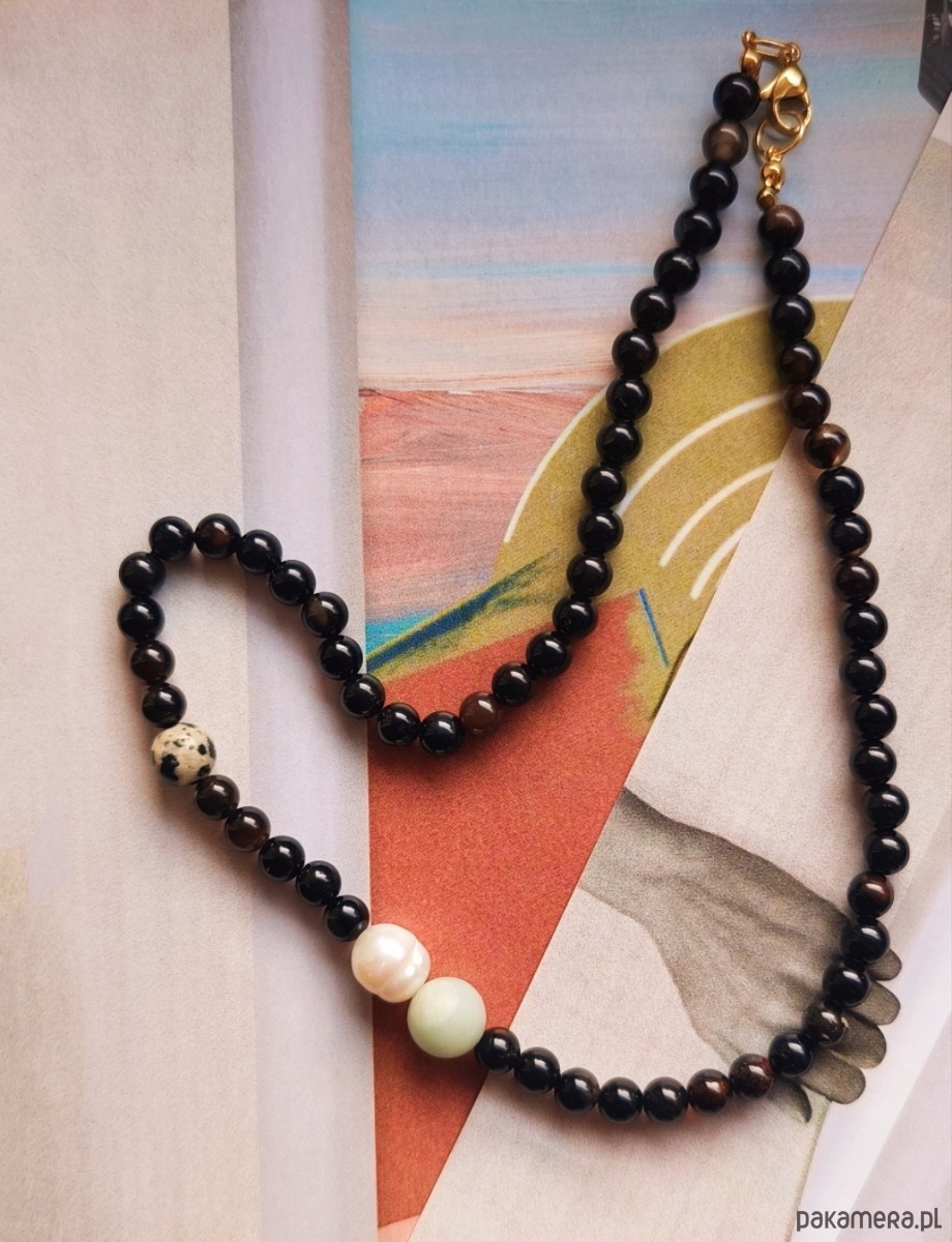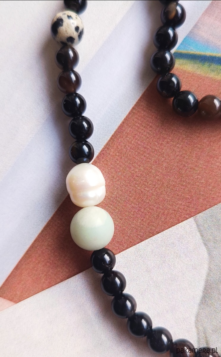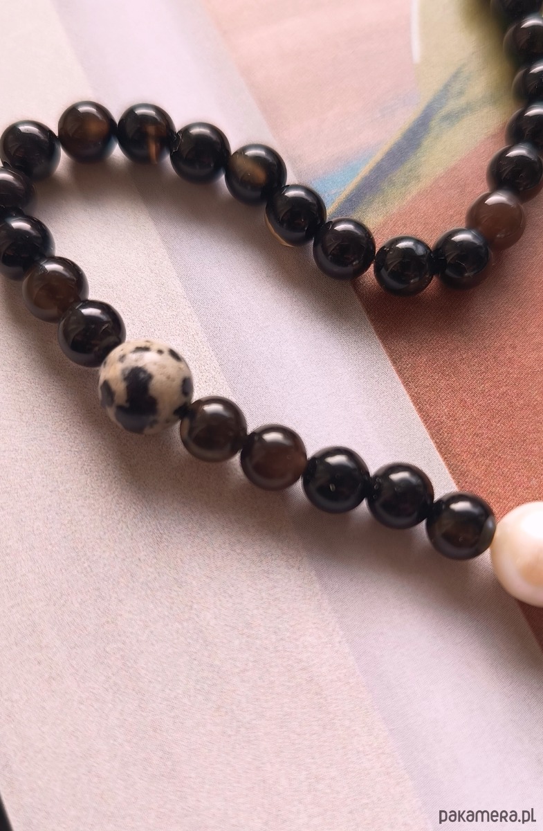 W dominancie agatów z akcentem z jaspisów i perły słodkowodnej.Zapięcie ze stali chirurgicznej.Długość 43cm z możliwością wydłużenia.