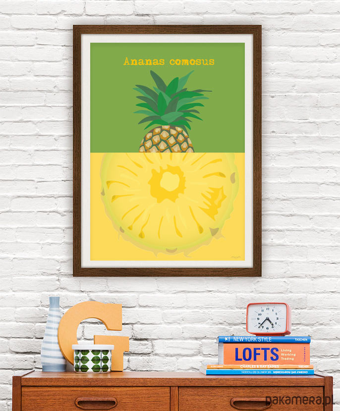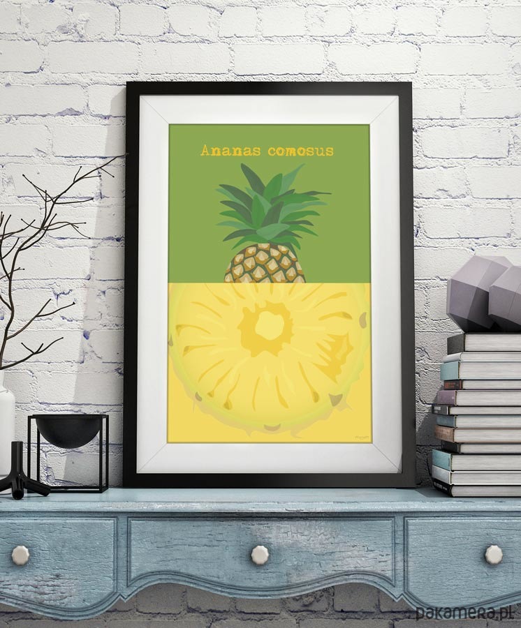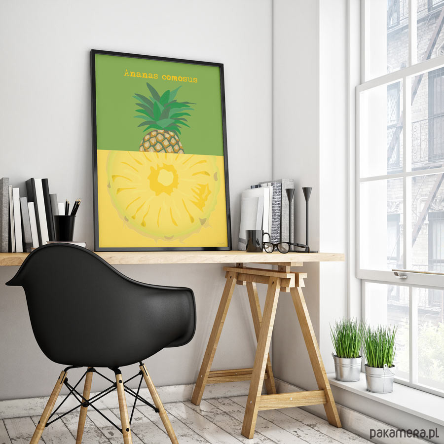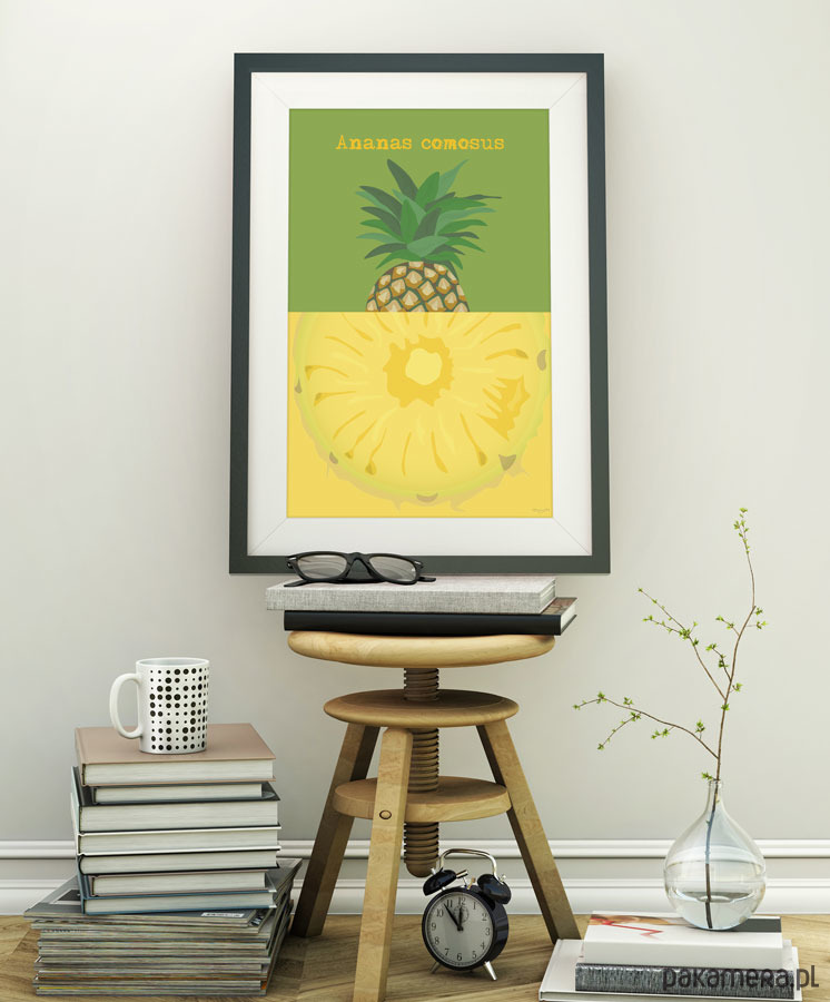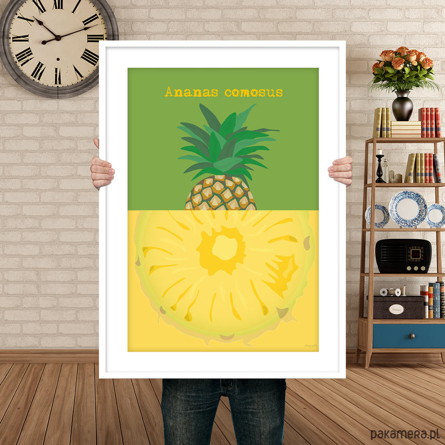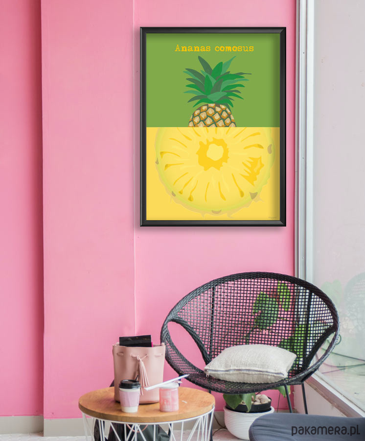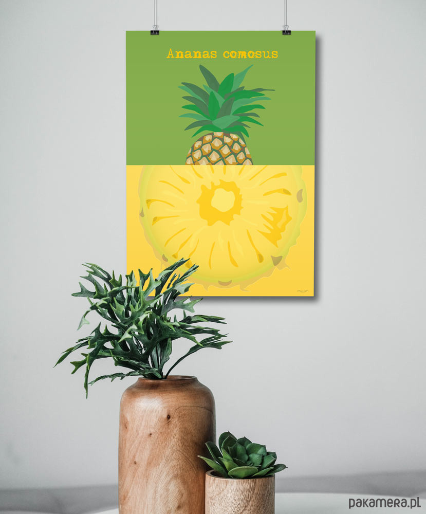 Plakat z autorską grafiką z serii Juicy fruits (Soczyste owoce). Przedstawia ananasa w dwóch odsłonach – pół owocu z zewnątrz z bujnymi liśćmi oraz zbliżenie na smakowite wnętrze. Oryginalna dekoracja do wymarzonej kuchni, salonu i jadalni.