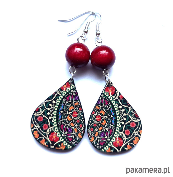 kolczyki drewniane, ozdobione metodą decoupage, dwustronne, starannie wykończone farbami akrylowymi i zabezpieczone wielokrotnie lakierem, koraliki drewniane, bigle posrebrzane, długość kolczyków bez bigli: 5,5 cm, szerokość: 2,5 cm, bardzo lekkie