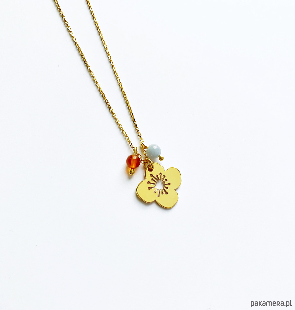 Zawilec anemone - naszyjnik z kwiatuszkiem zawilca z dodatkiem małych kamieni angelitu oraz pomarańczowego karneolu.