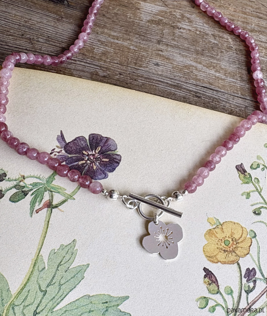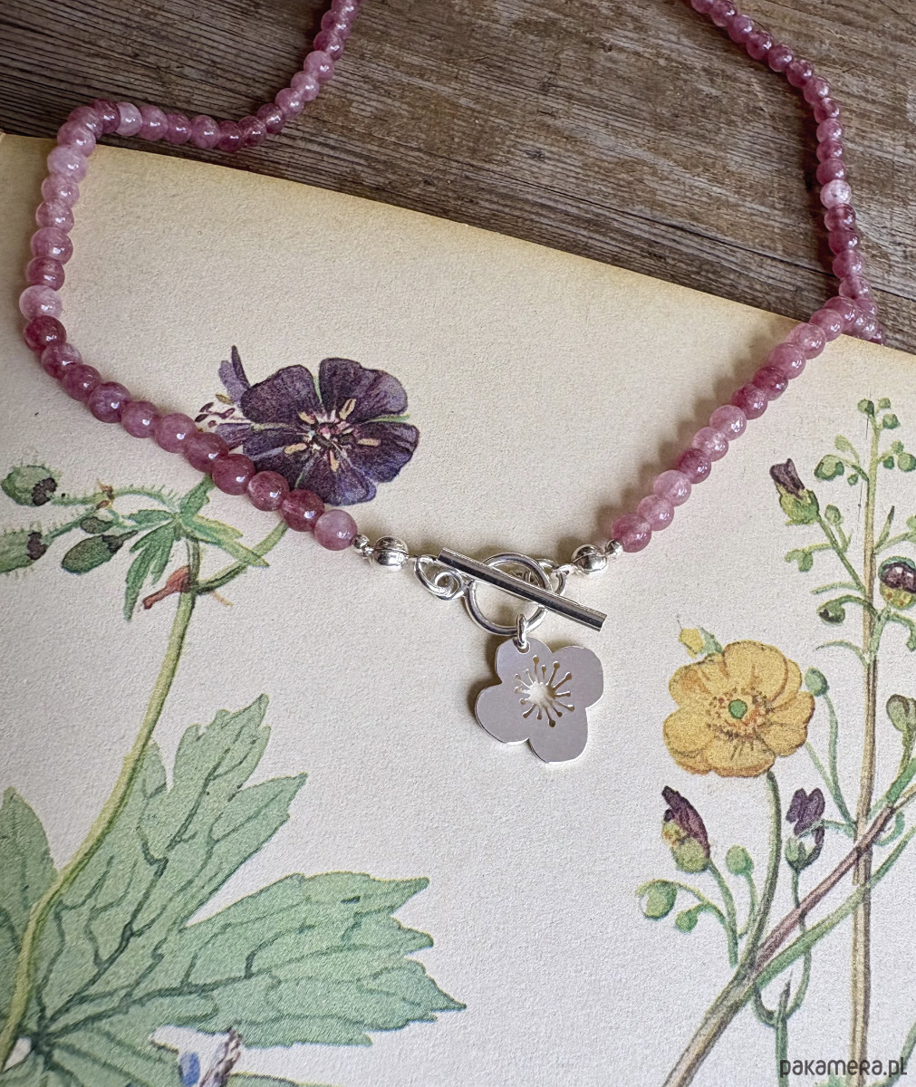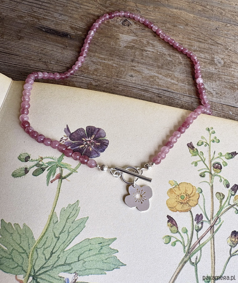 Anemone pink, naszyjnik z kwiatuszkiem zawilca z dodatkiem małych, cieniowanych kamieni kwarcu truskawkowego.