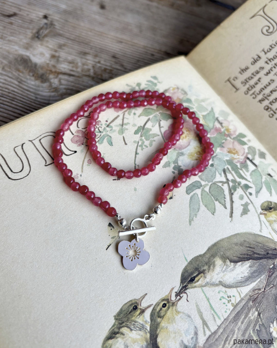 Anemone pink, naszyjnik z kwiatuszkiem zawilca z dodatkiem soczystego jadeitu malinowego.