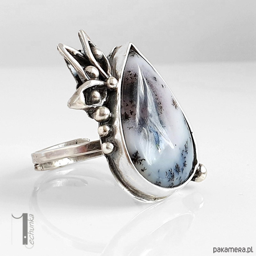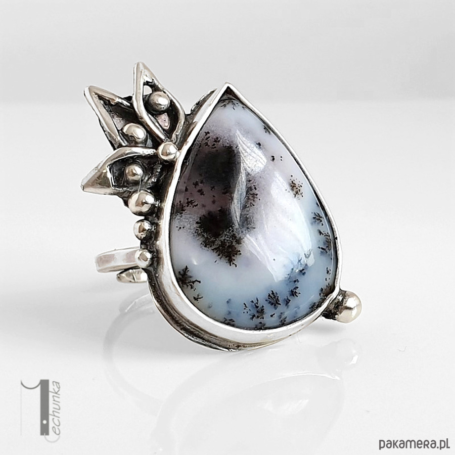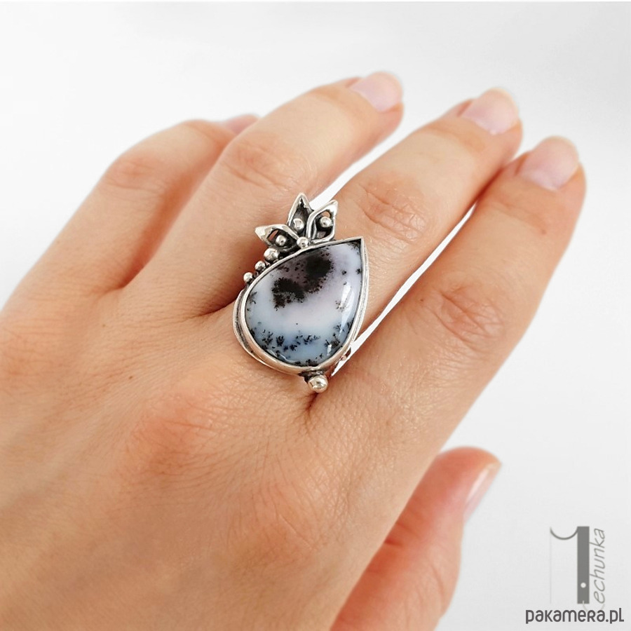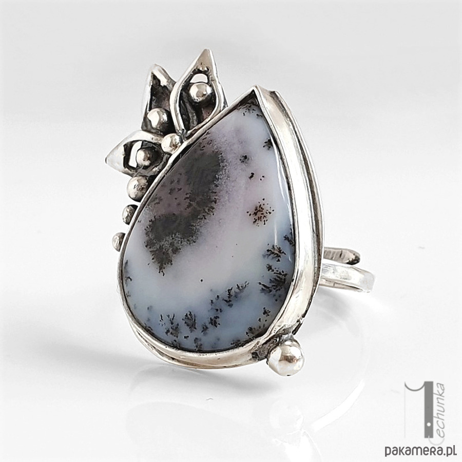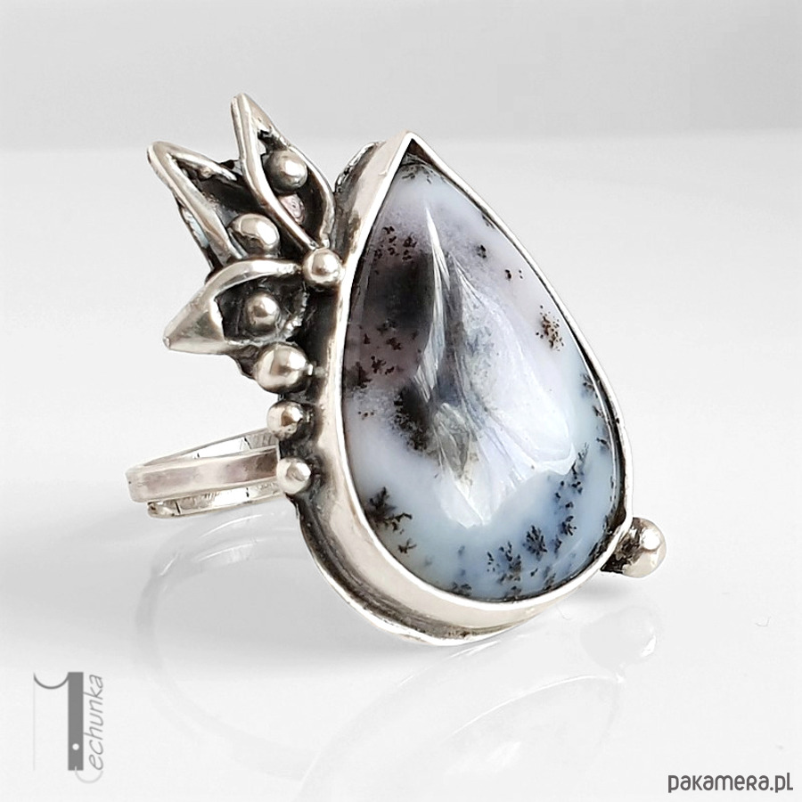 Baśniowy, srebrny, regulowany pierścień o florystycznej formie ozdobiony agatem dendrytowym. Pierścionek zdobi minerał o biało szarej barwie w otoczeniu oksydowanego srebra. Wymiary korony pierścionka: ok 24x30mm, wymiary kaboszonu 17x24mm. Rozmiar obrączki regulowany. Biżuteria zostanie ozdobnie zapakowana.