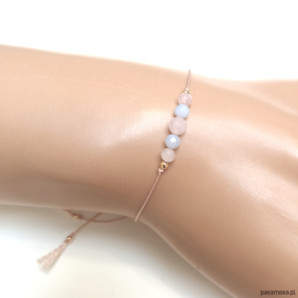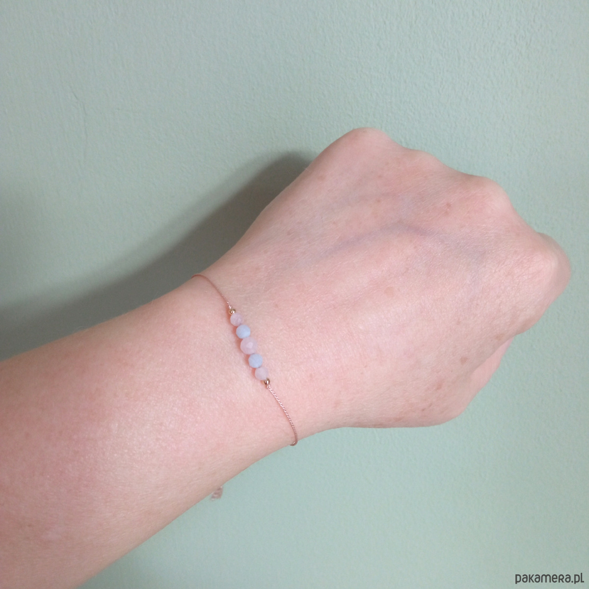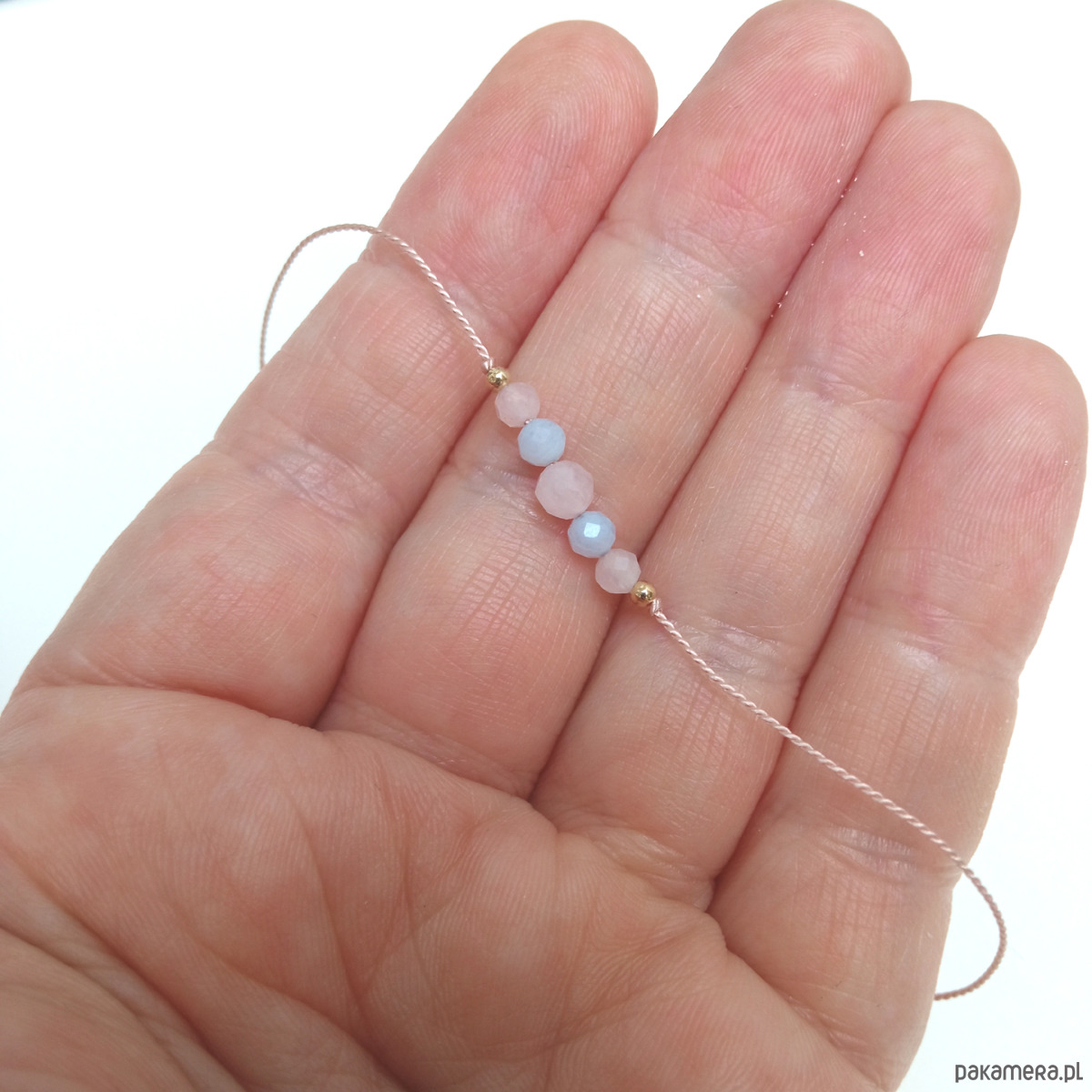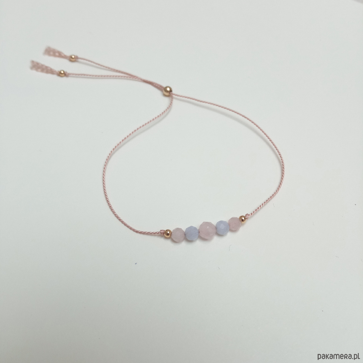 Materiał: różowy kwarc (3 i 2,5 mm), niebieski chalcedon (2,5 mm), 100 % jedwabny sznureczek; do wyboru trzy rodzaje wykończenia: pozłacany mosiądz, srebro i tzw. gold filled.