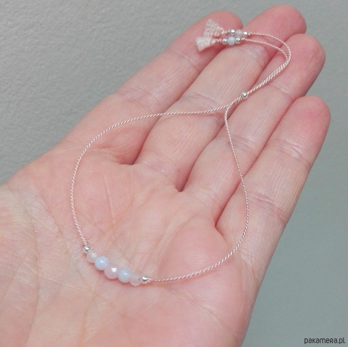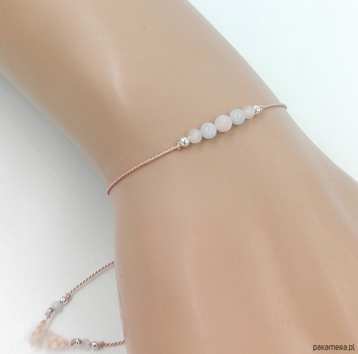 Materiał: różowy kwarc (2 i 3,5 mm), niebieski chalcedon (3 mm), 100 % jedwabny sznureczek; do wyboru trzy rodzaje wykończenia: pozłacany mosiądz, srebro i tzw. gold filled.