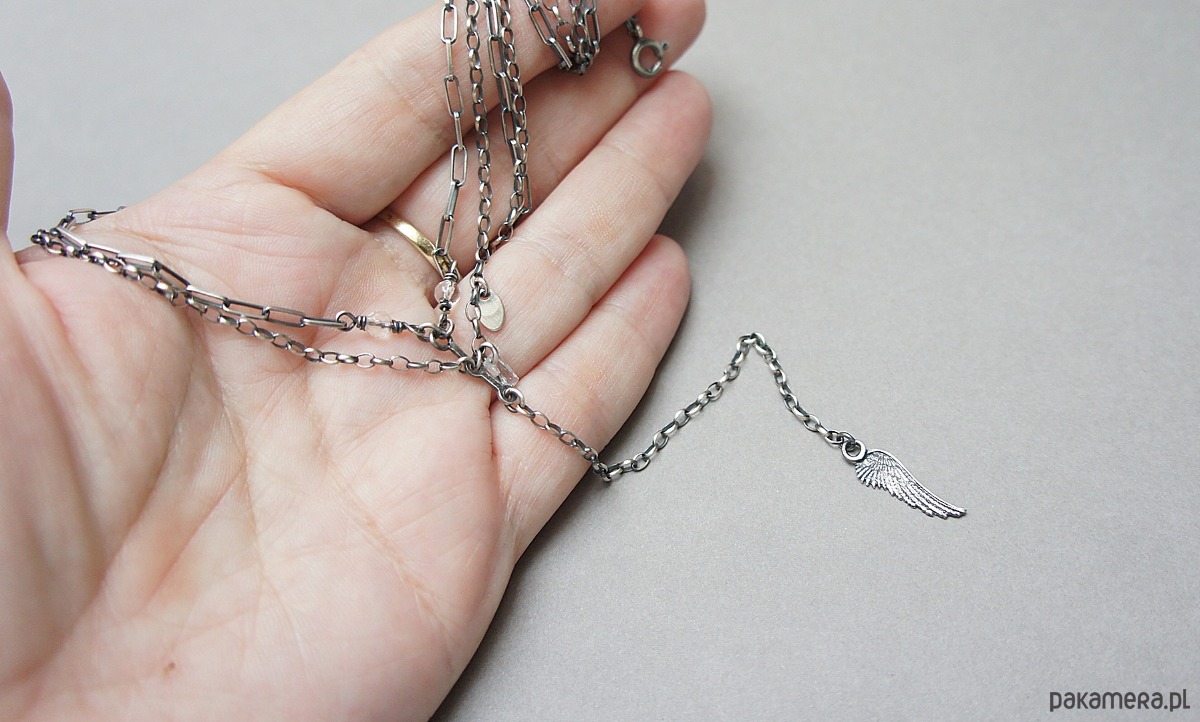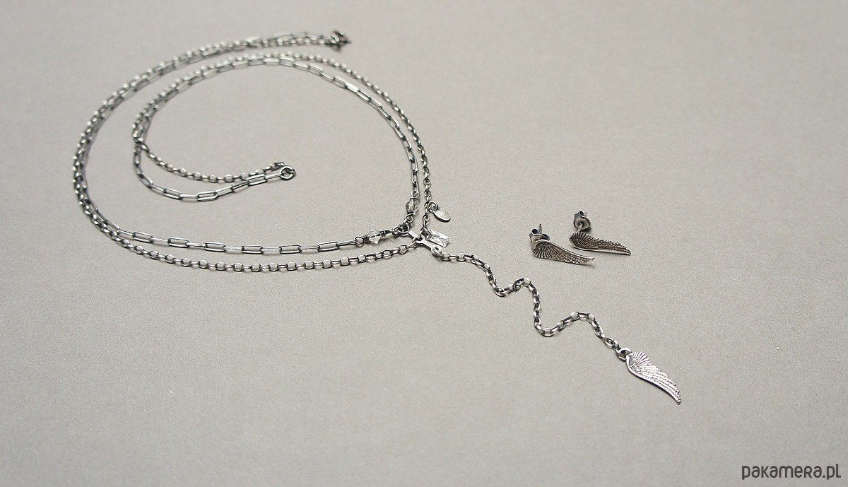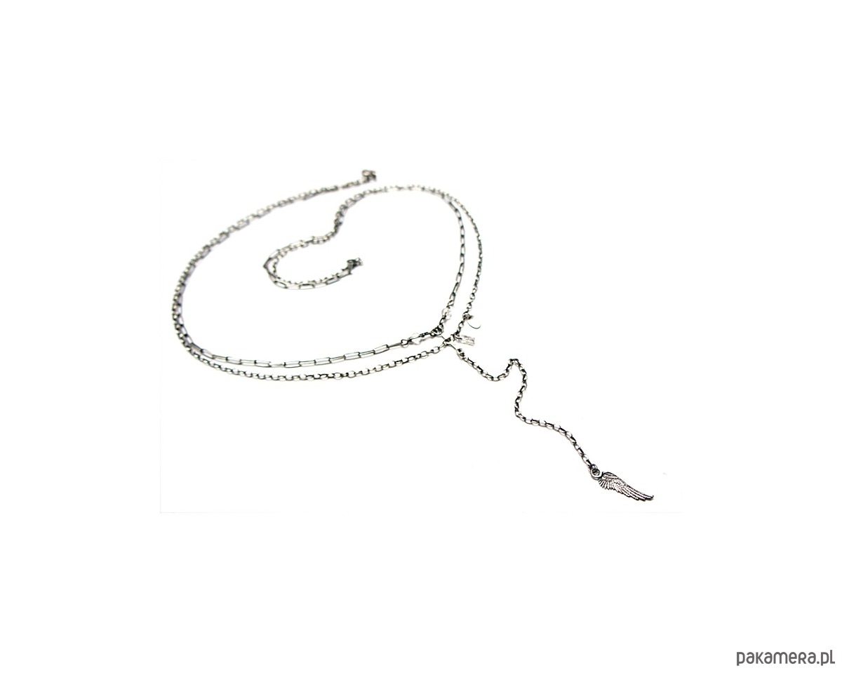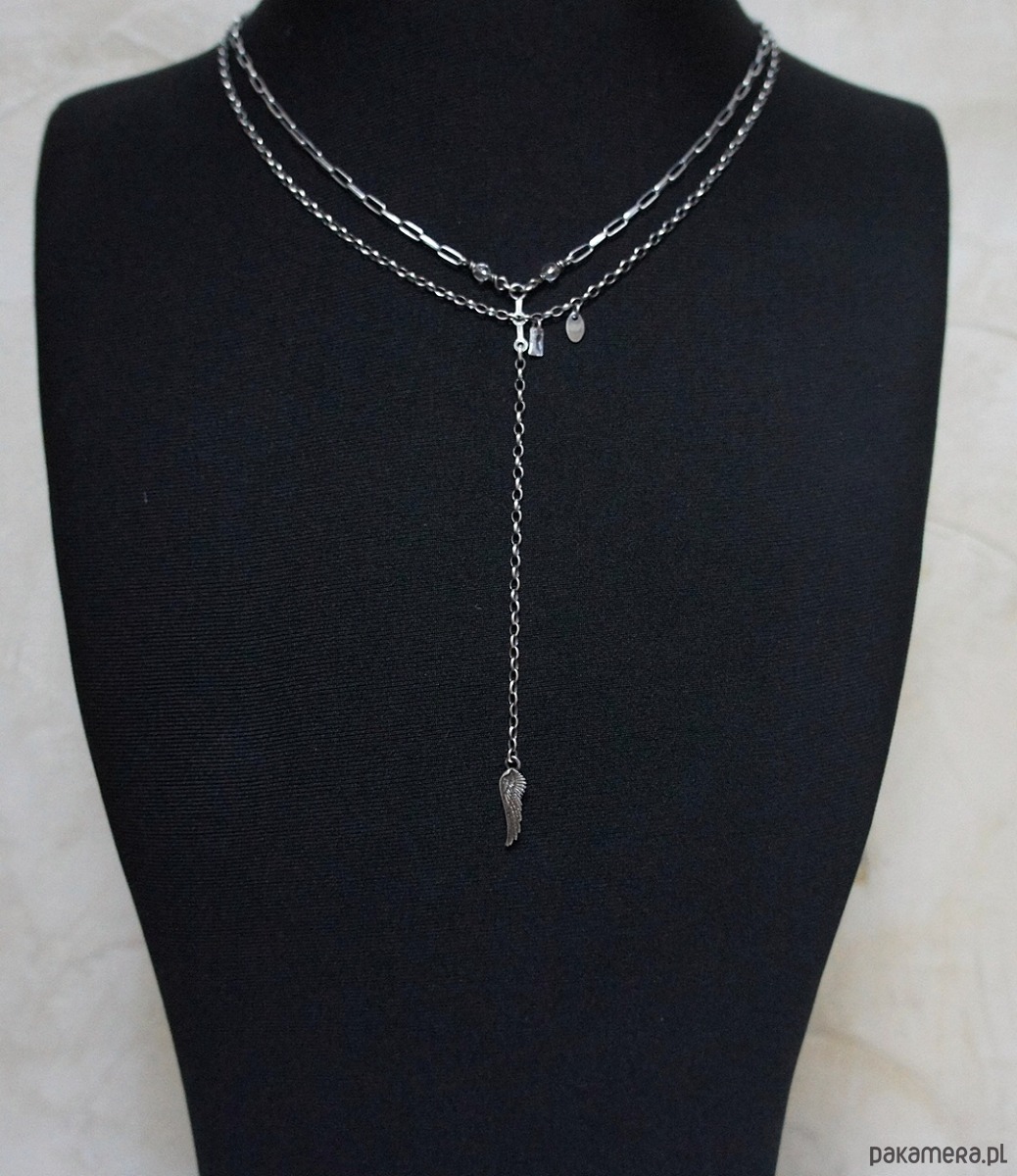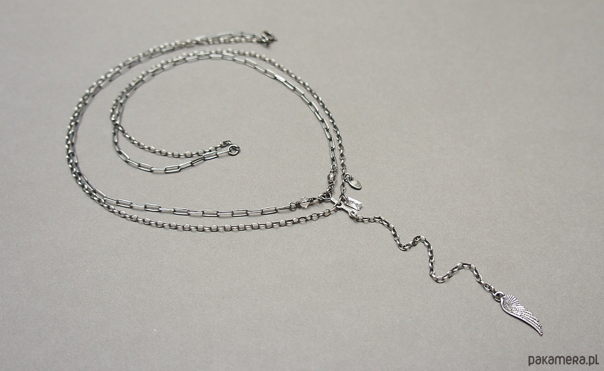 Naszyjnik wykonany ze srebra [pr. 925] w połączeniu z fasetowanymi kryształami górskimi [4mm] bagietką cyrkonii oraz skrzydełkiem . Całość oksydowana i przetarta. Całkowita długość łańcuszka około 46,5cm[ po krótszym obwodzie]. Długość części wiszącej 12cm.Biżuteria ozdobnie zapakowana