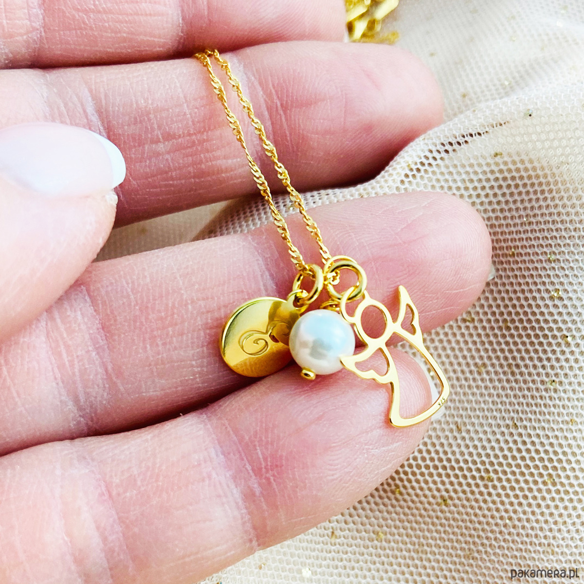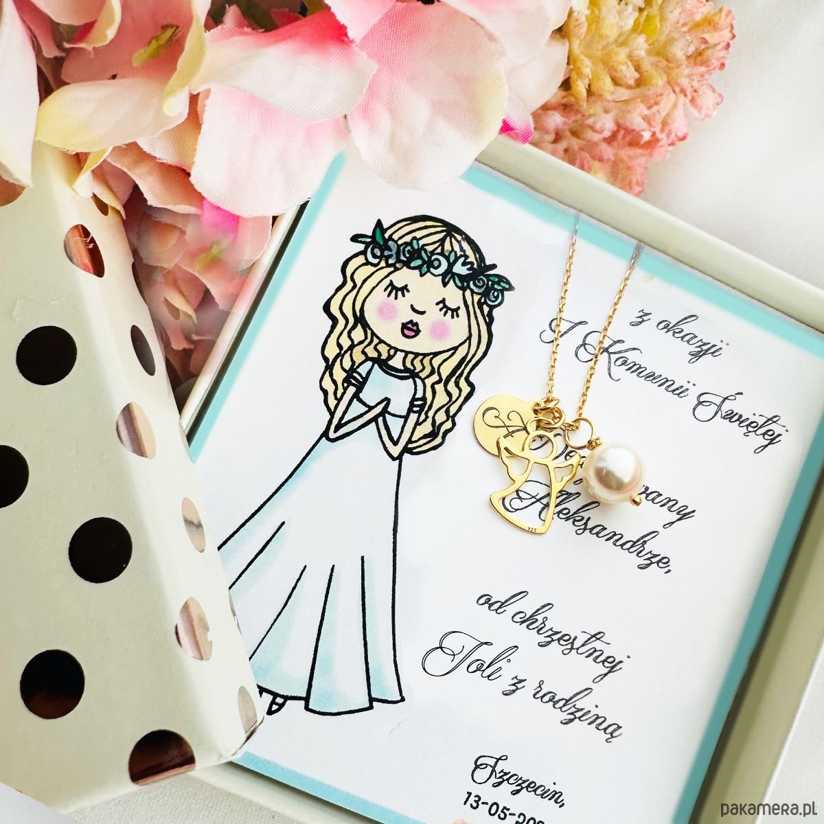 Wyjątkowy unikalny prezent dla dziewczynki z okazji Pierwszej Komunii , zawiera ponadczasowy naszyjnik z perłą Gavbari z wybranym inicjałem i aniołkiem ze srebra złoconego 24 k złotem ( opcjonalnie z wykonaną ręcznie kartą z życzeniami).