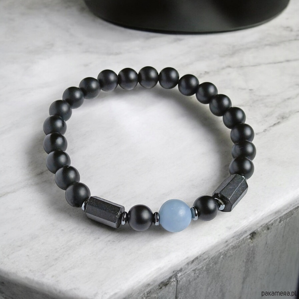 Niezwykle ciekawa bransoletka- talizman wykonana z matowego onyksu (8mm), czarnego turmalinu (surowe bryłki ok. 12mm) i matowej kuli angelitu w centrum (10mm). Przekładki - hematyt.