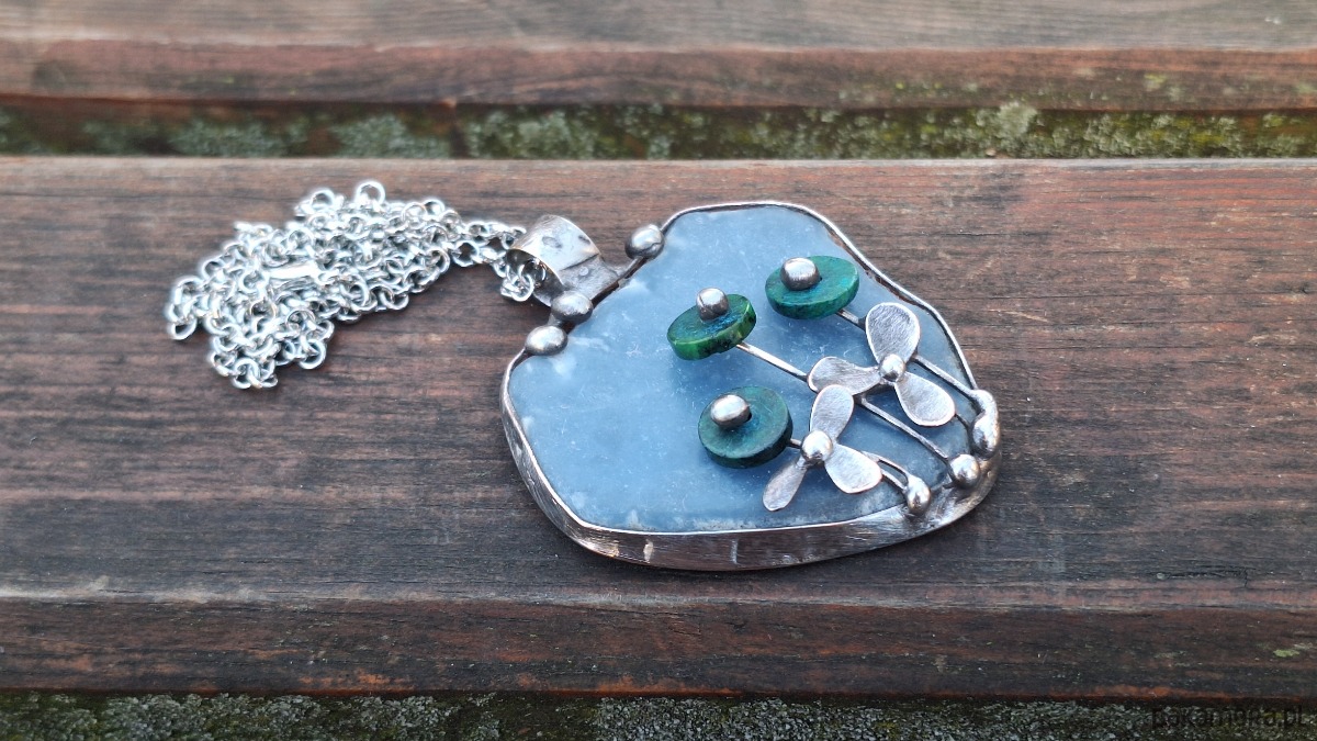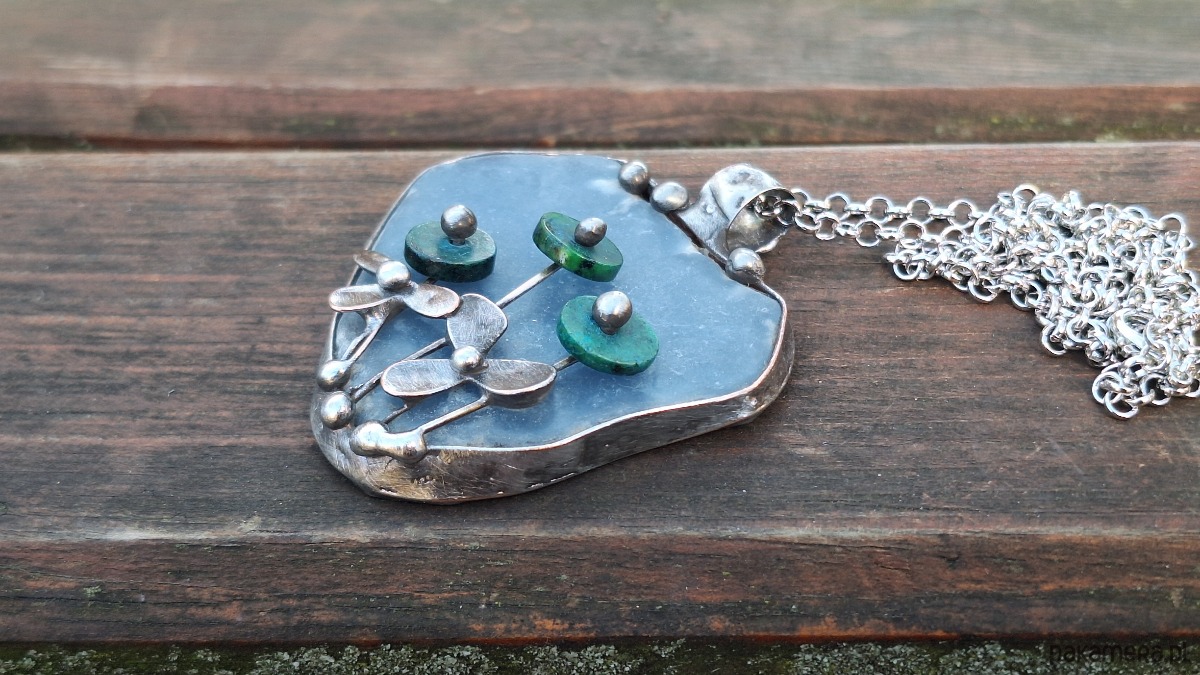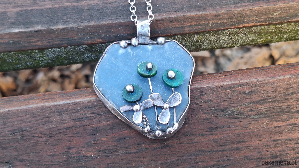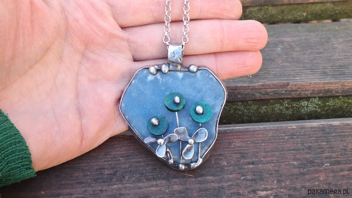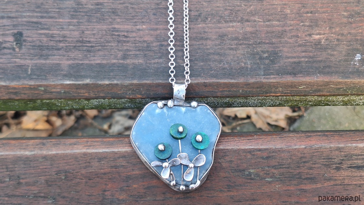 Wisiorek wykonany z miedzi, cyny, chryzokoli i angelitu. Wymiary ok. 5.5 na 5 cm. Zawieszony na łańcuszku o długości ok. 50 cm.