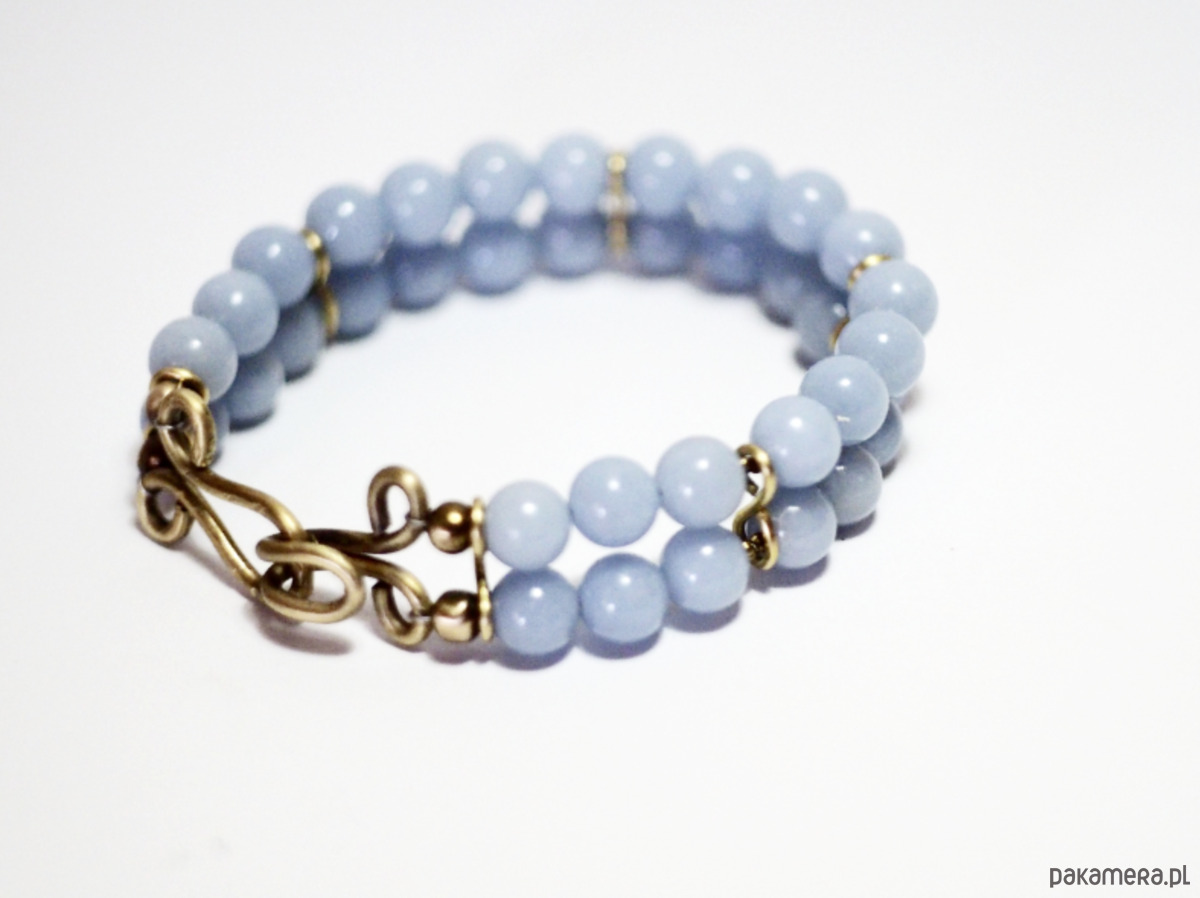 Bransoletka z angelitem. Ręcznie kute, mosiężne zapięcie. Dwa rzędy kulek o średnicy 8 mm. Całkowita długość 20 cm. Po zapięciu jest krótsza o około 3 mm. Idealna na rękę o obwodzie (mierzona tuż za nadgarstkiem) 17,5 - 18,5 cm. Jest możliwość zamówienia w innym rozmiarze. Zapraszam do kontaktu.