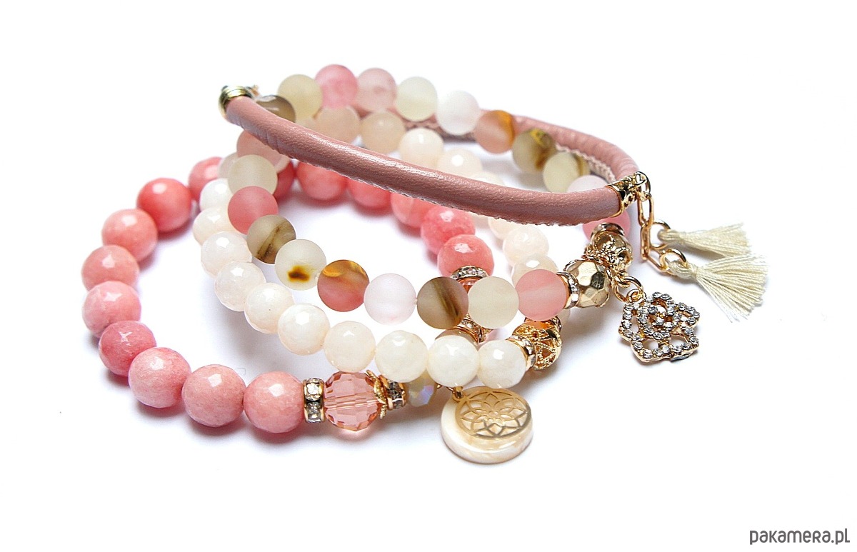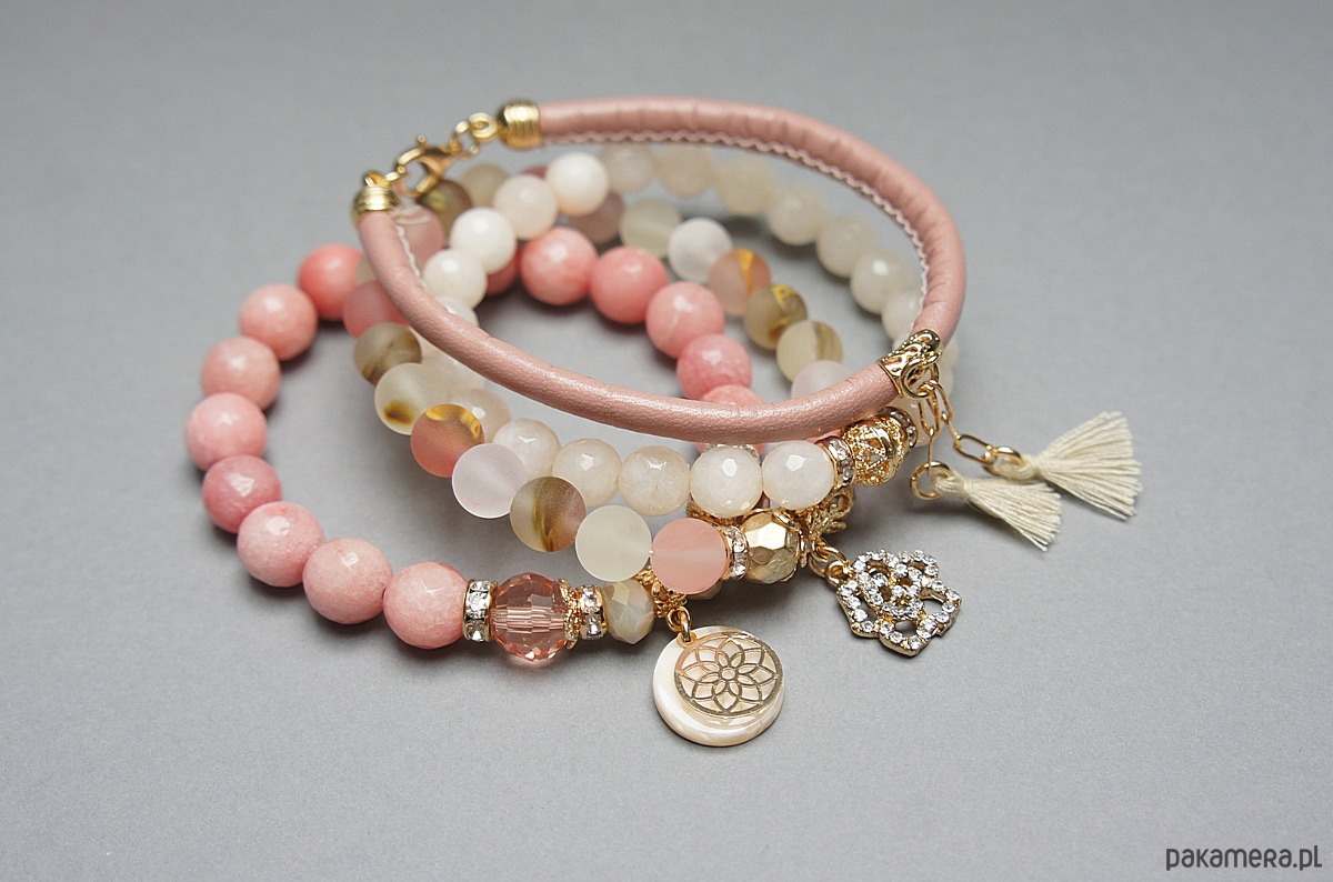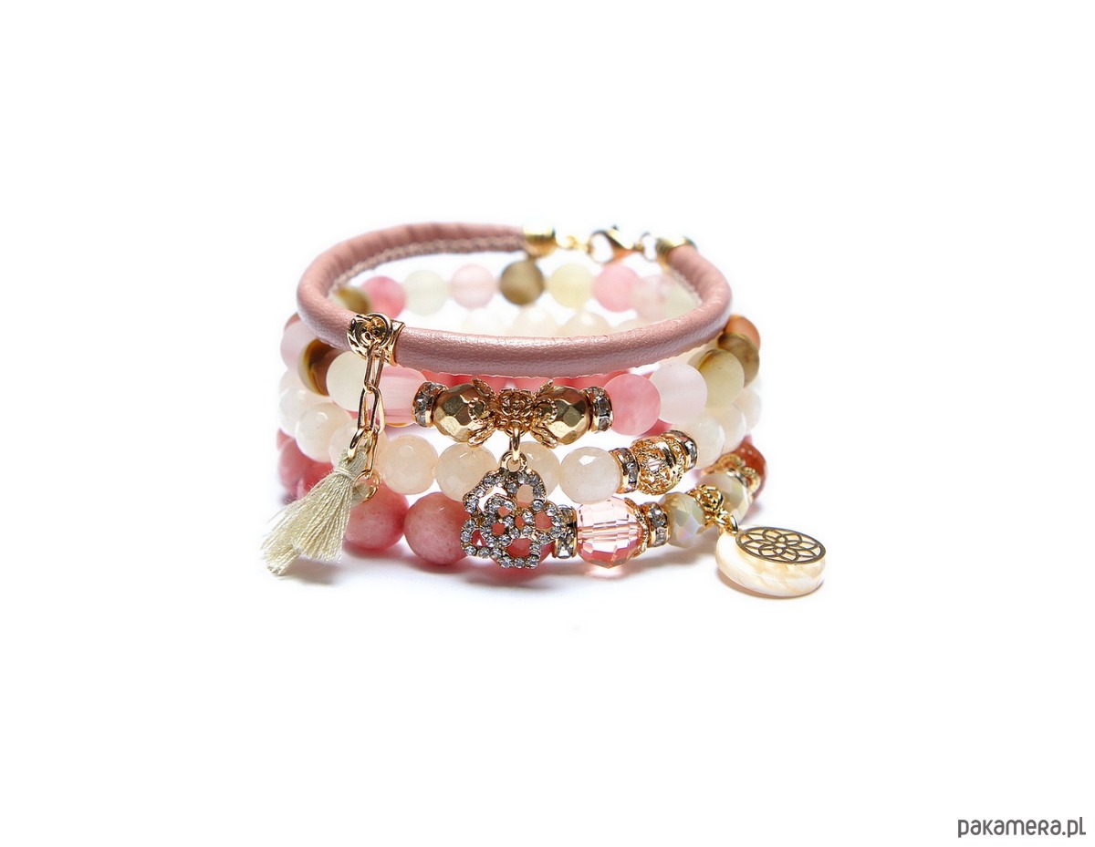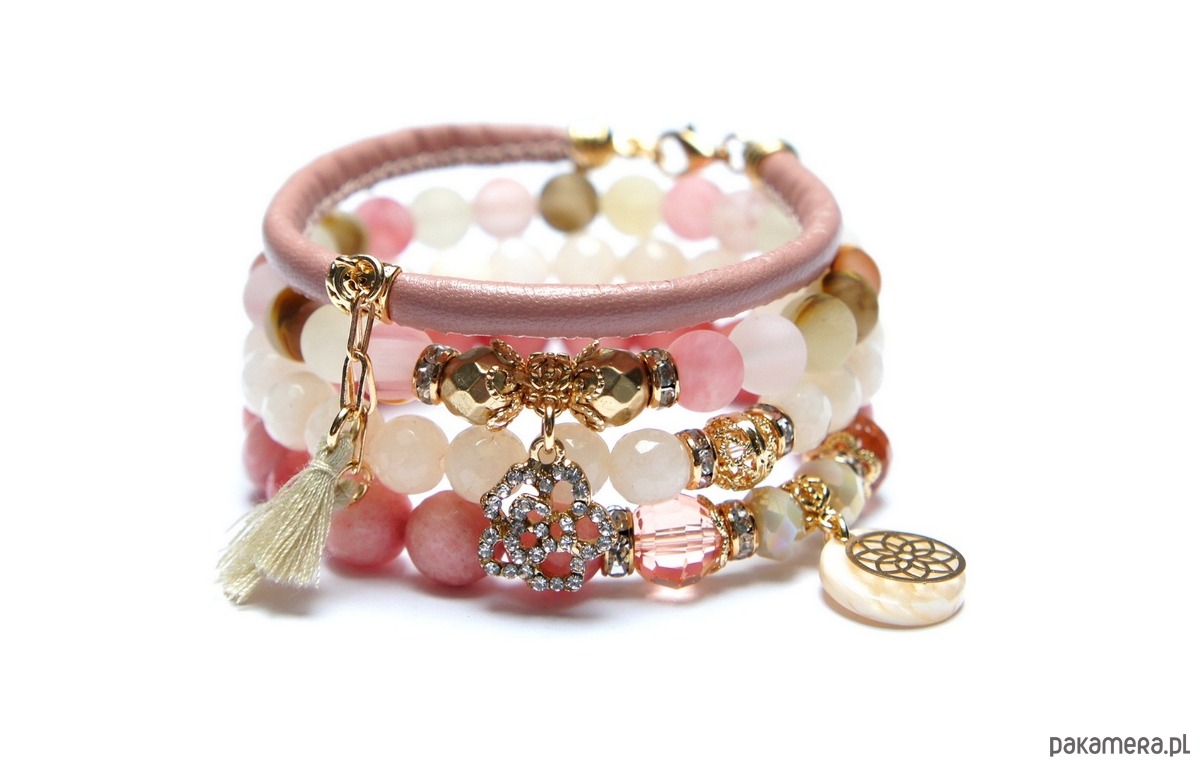 Komplet czterech bransoletek wykonanych z naturalnych kamieni: jadeity [8 i 10mm], kwarc matowy [8mm], kryształków fasetowanych [8 i 10mm], hematyt fasetowany, platerowany [8mm], rzemienia z naturalnej skórki, zawieszki wysadzanej cyrkoniami, chwostów, zawieszki z żywicy oraz elementów metalowych w kolorze złota. Bransoletki pasują na nadgarstek 16 - 17cm.