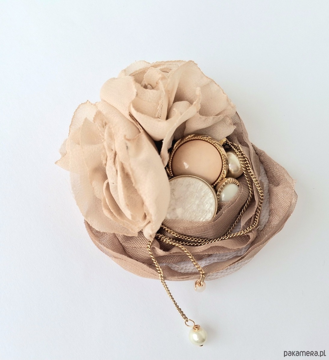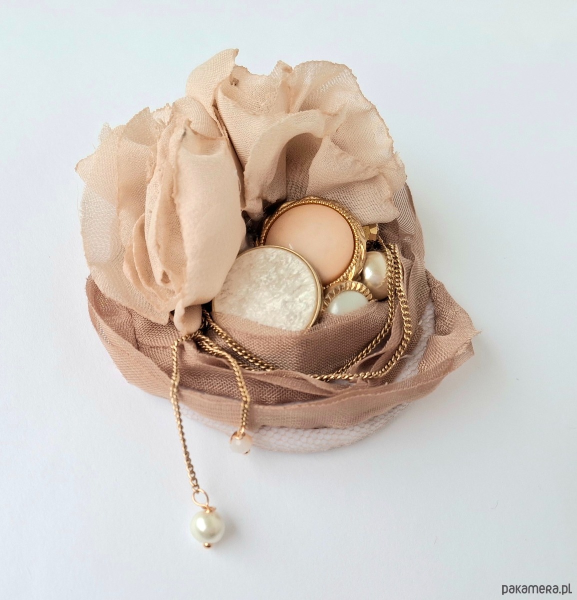 broszka wykonana w technice kolażu w pojedynczym egzemplarzu z myślą o osobach, które szukają urozmaicenia przy codziennych stylizacjach. Jest w niej zawarte wiele struktur i odcieni.Cieple beże,kremy i złoto dodają szyku kreacji będąc jednocześnie bardzo uniwersalnym dodatkiem który można wykorzystać do wielu stylizacji.