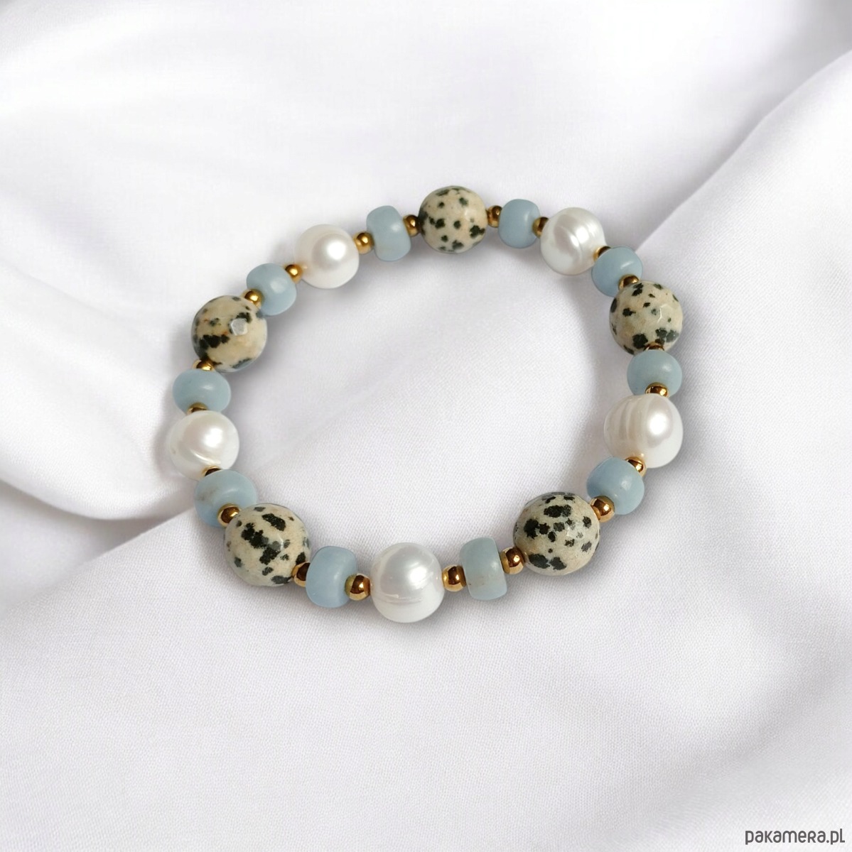 Anielska bransoletka : angelit, perły, jaspis : na gumce