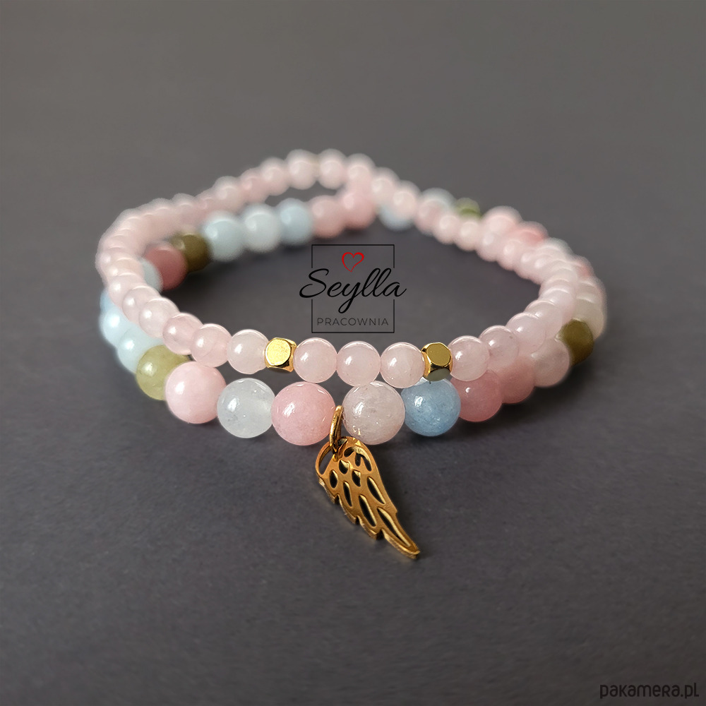 Morganit, kwarc różowy oraz przywieszka z kolorze złota- skrzydełko (stal nierdzewna)- symbol regeneracji, swobody, niezależności i wolności.
