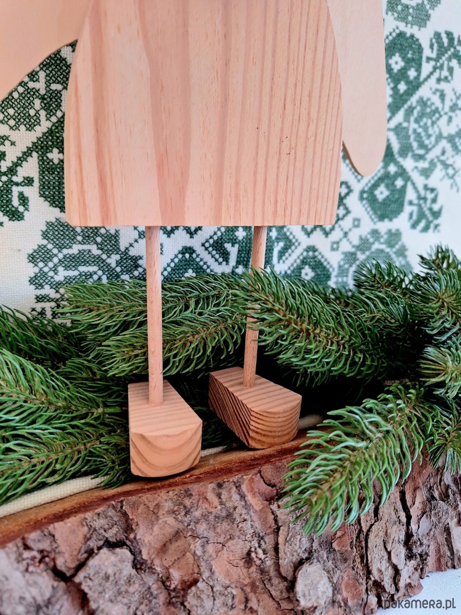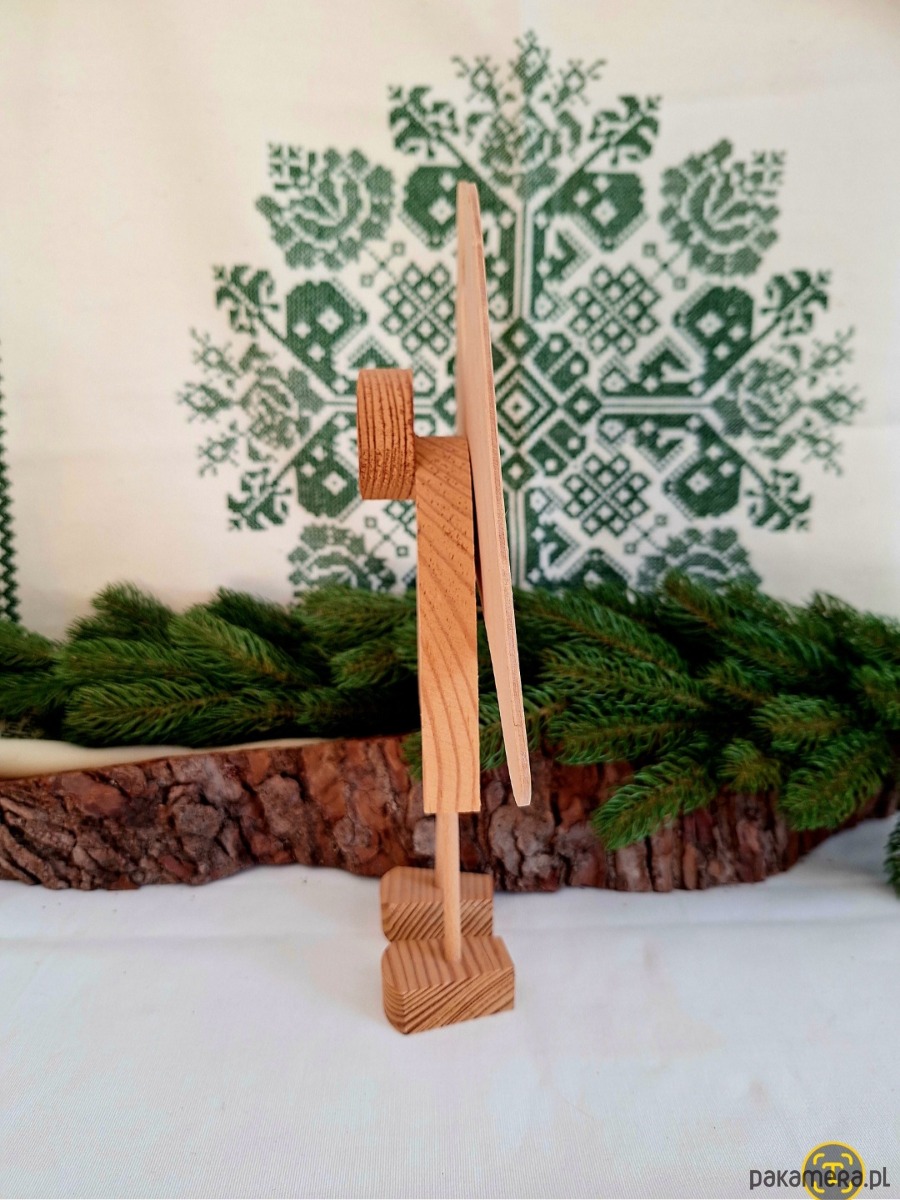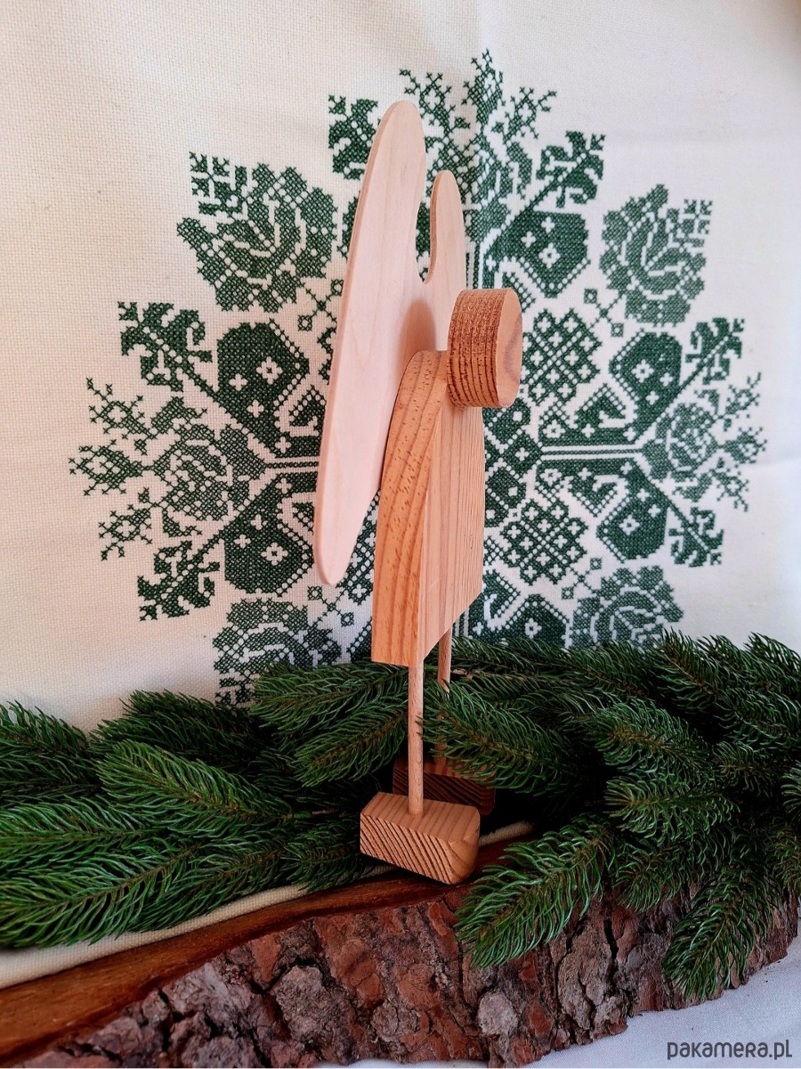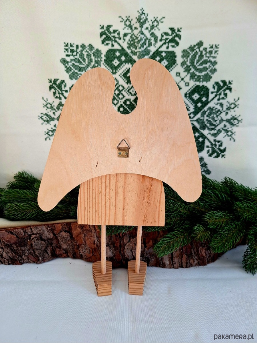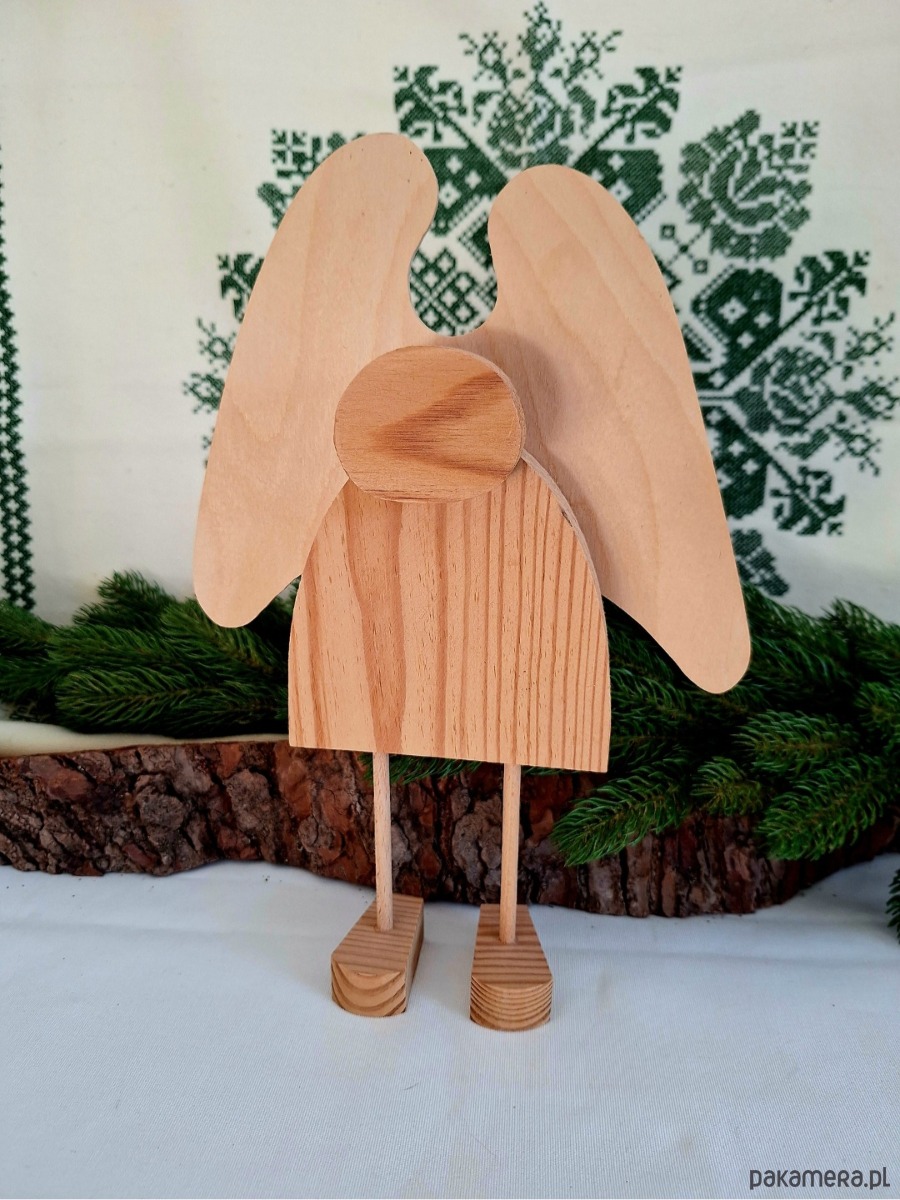 Figurka anioła stojąca; może również stanowić dekorację ścienną-z tyłu znajduje się metalowy haczyk do zawieszenia. Anioł wykonany z kawałków drewna i sklejki. Minimalistyczny charakter, surowe drzewo, nawiązanie do tradycyjnego ludowego rzemiosła, nadaje się do samodzielnego pomalowania czy ozdobienia.