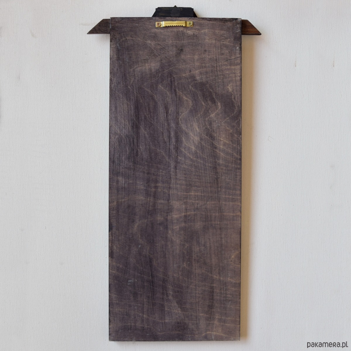 Obraz w technice mieszanej na drewnie - sklejce sosnowej z nieregularną "ramką" z listewek dębowych i sosnowych - tło i "ramka" pokryte są bejcą, postać została namalowana farbami akrylowymi. W projekcie wykorzystany jest również metalowy dekor i elementy collage.