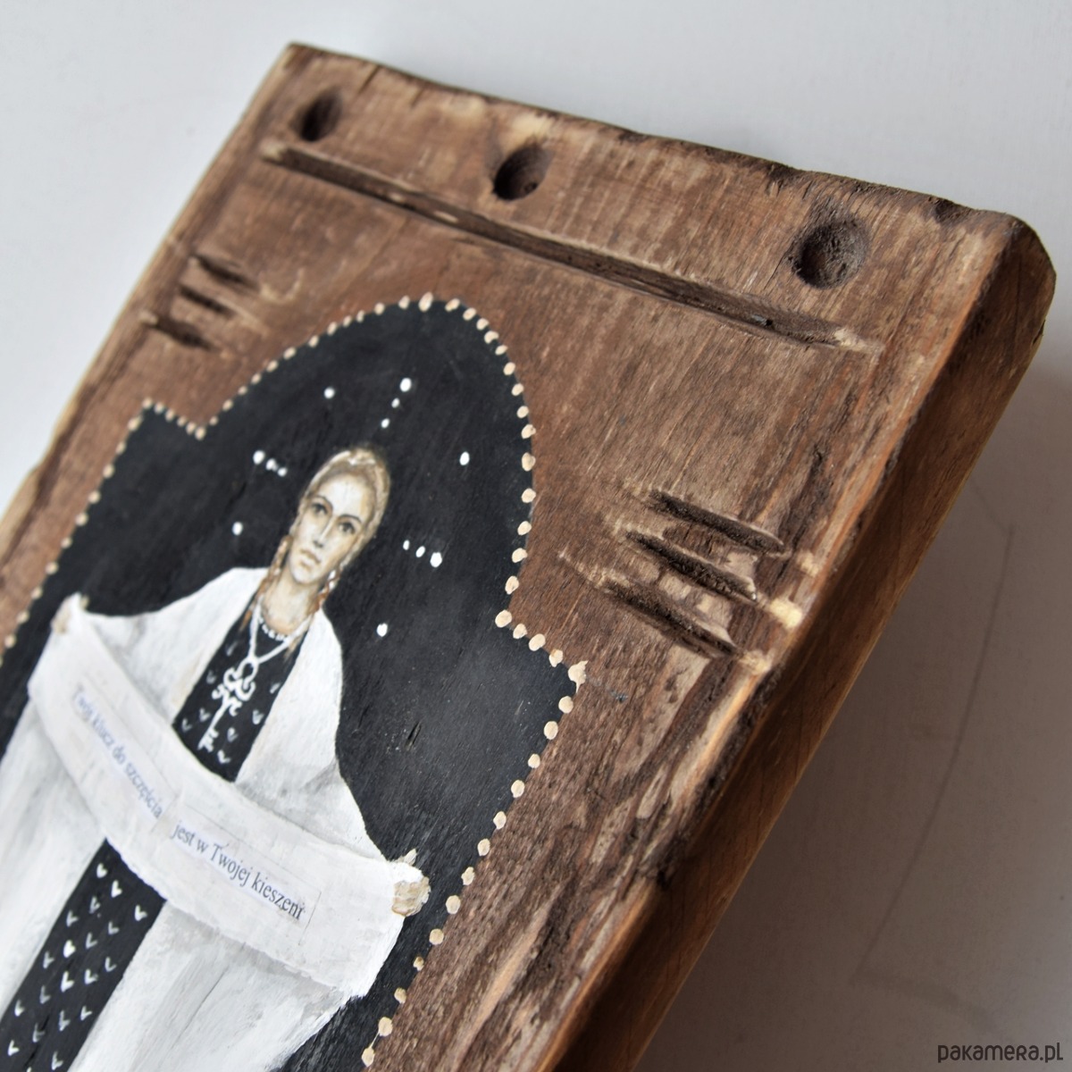 Obraz malowany na grubej desce sosnowej z rzeźbionymi ornamentami - deska jest bejcowana, postać anioła malowana farbami akrylowymi.