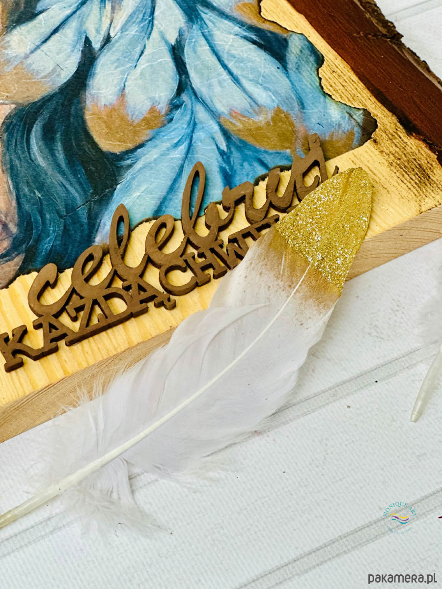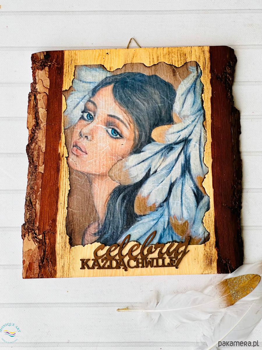 Drewniana deska i anioł z piórami – wyjątkowa dekoracja z głęboką symboliką.