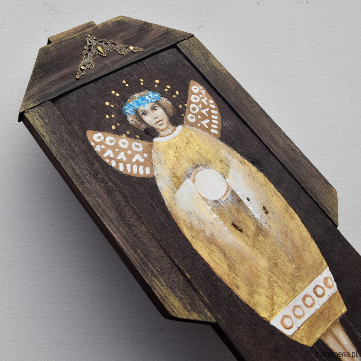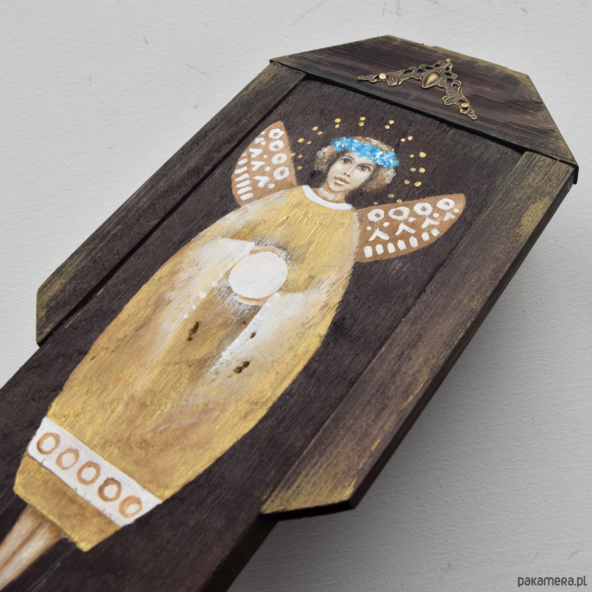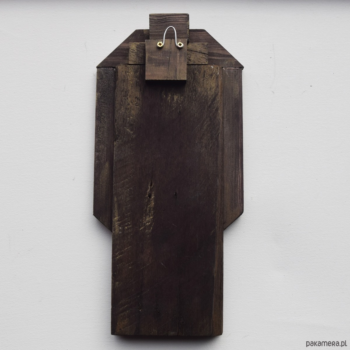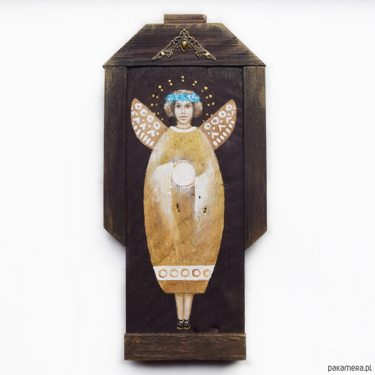 Obraz malowany farbami akrylowymi na starej desce (drewno pokryte bejcą, postać anioła malowana farbami akrylowymi). W desce celowo zostawiłam niedoskonałości w postaci nierówności i otworów po gwoździach by zachować jej historię. W projekcie wykorzystane są również listewki z sosny/świerku i dębu oraz metalowy dekor.