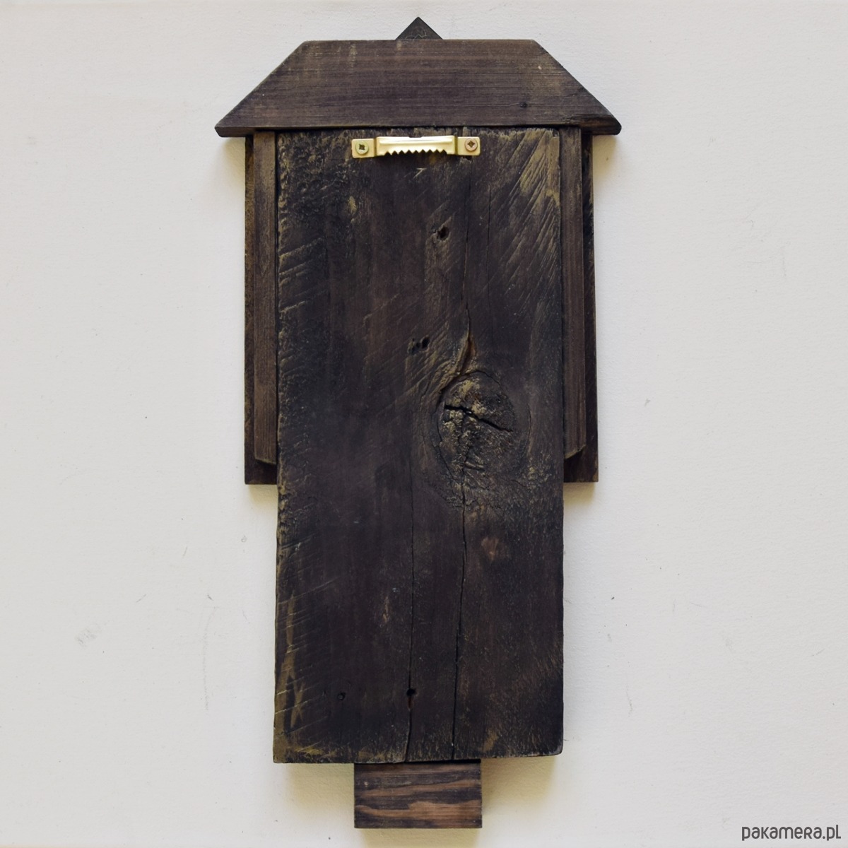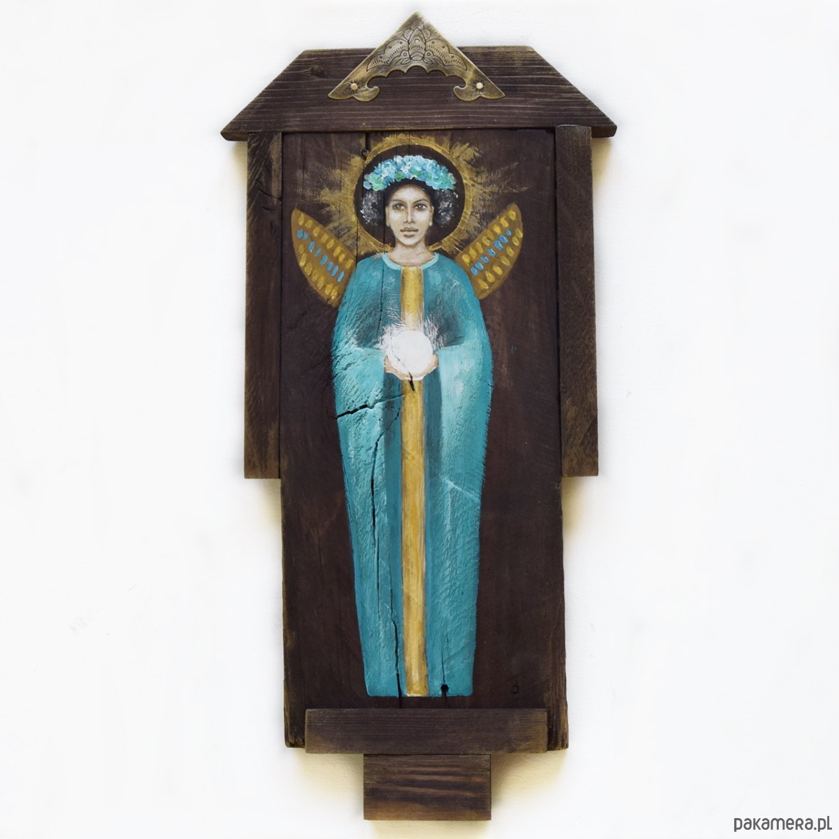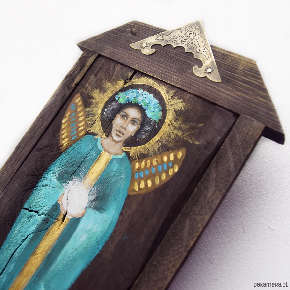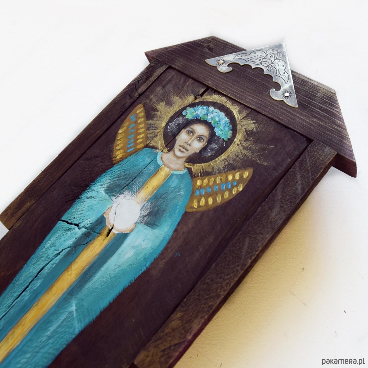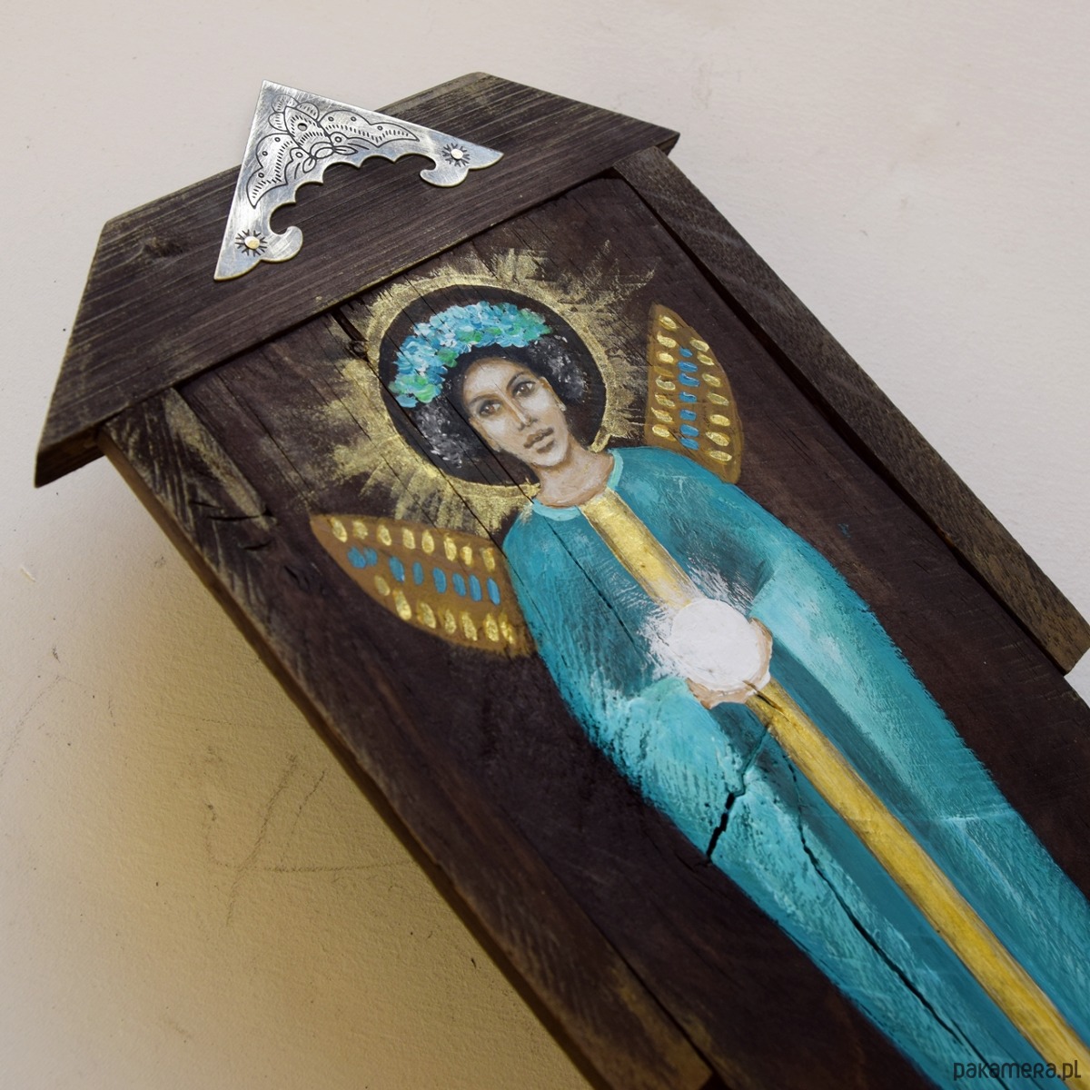 Obraz malowany farbami akrylowymi na starej desce (drewno pokryte bejcą, postać anioła malowana farbami akrylowymi). W desce celowo zostawiłam niedoskonałości w postaci nierówności i otworów po gwoździach by zachować jej historię. W projekcie wykorzystane są również listewki z sosny/świerku i dębu oraz metalowy dekor.