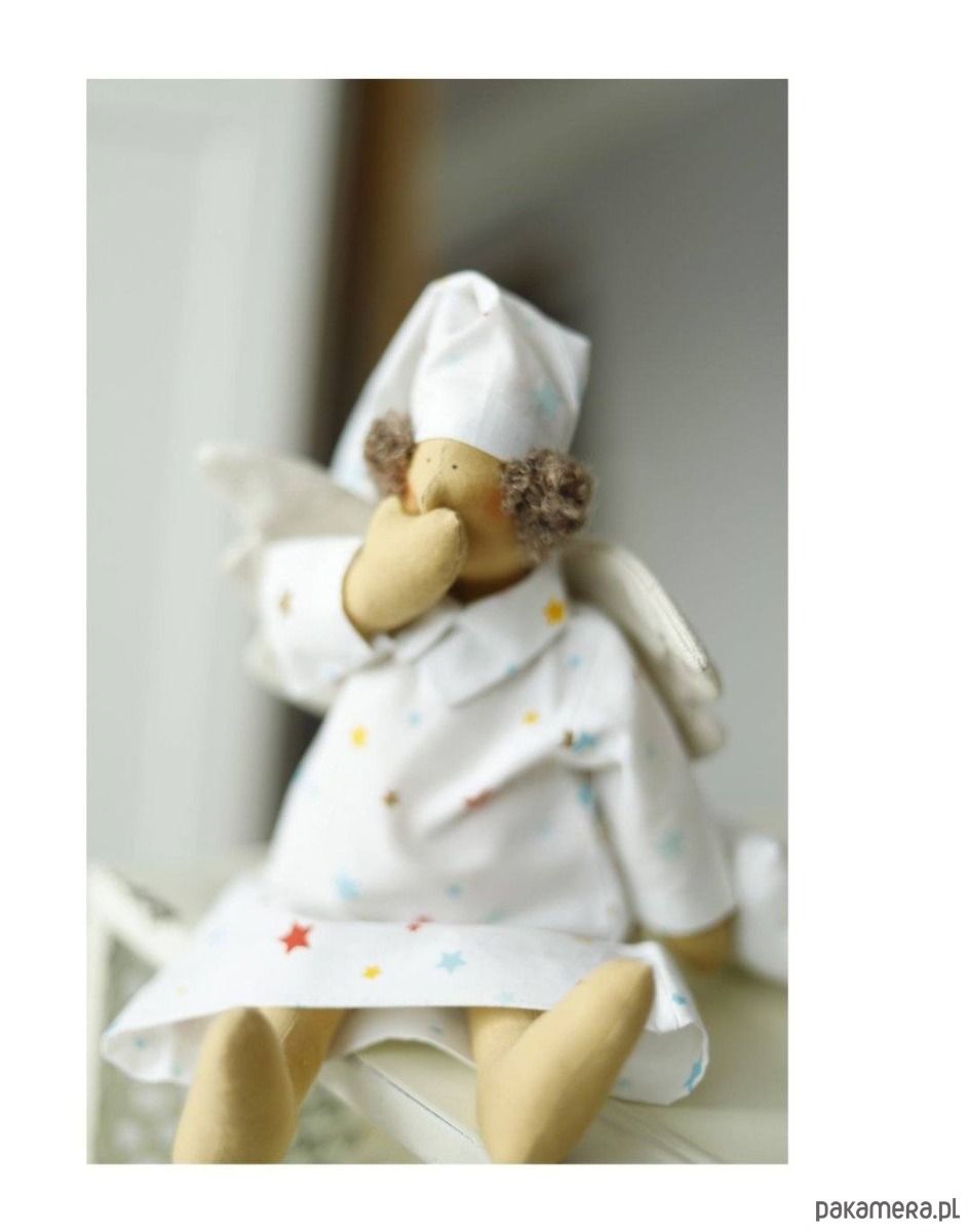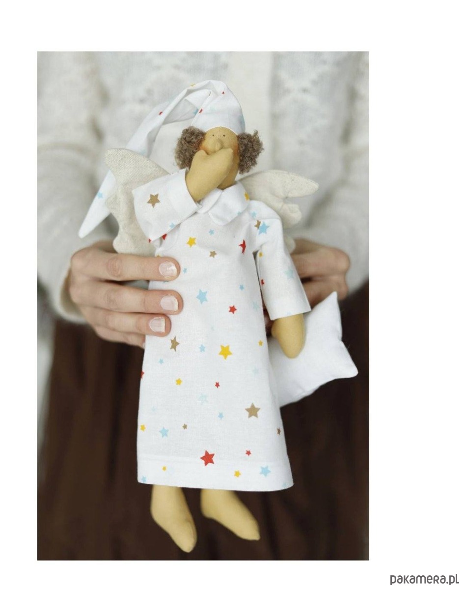 Uszyty z bawełny, wypełniony certyfikowana owatą. Anioł posiada zawieszkę. Wysokość 35-38 cm.
