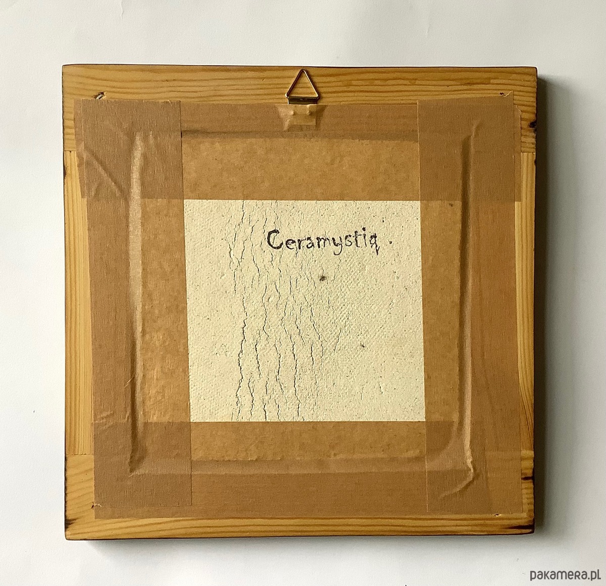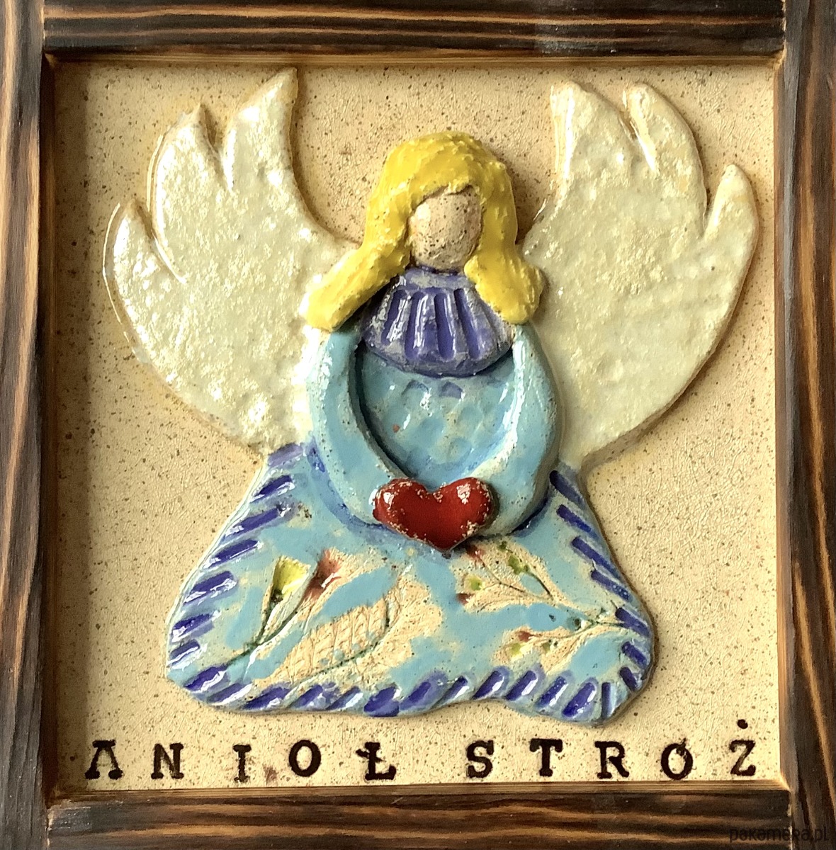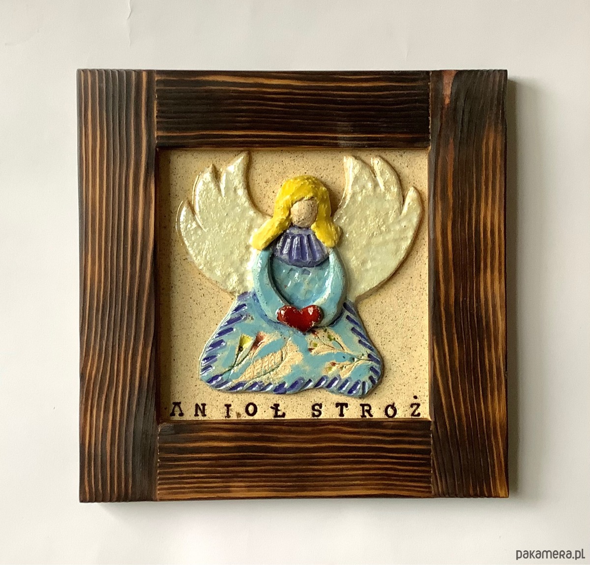 Ceramiczny obraz wykonany całkowicie ręcznie metodą lepienia. Wkomponowany w drewnianą ramkę (również wykonaną ręcznie). Z tylu zawieszka.