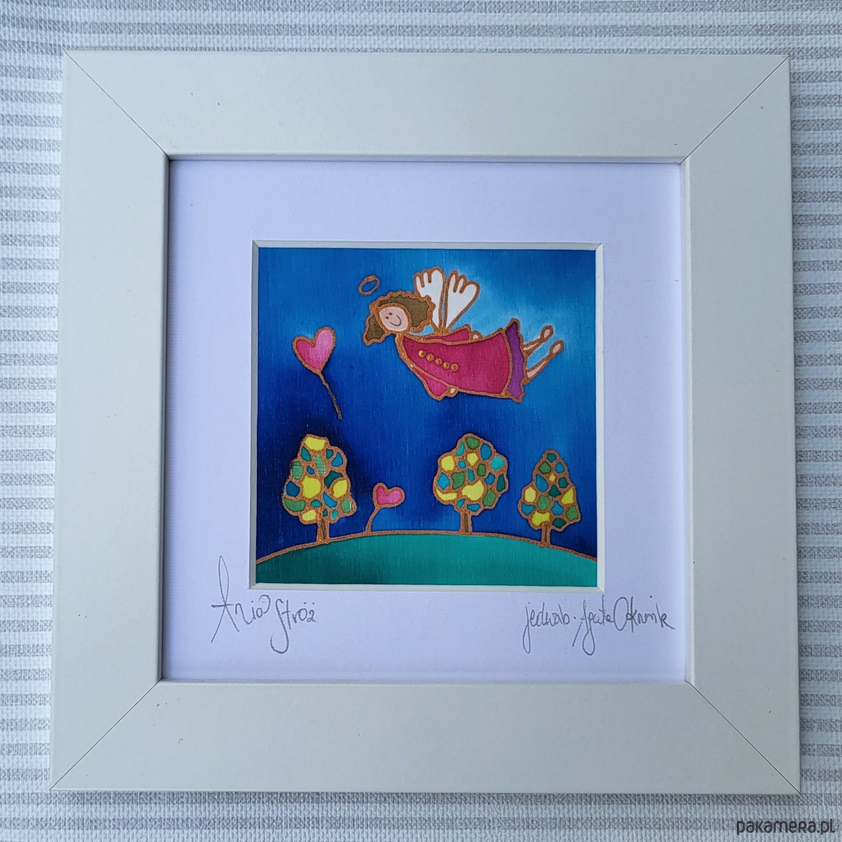 Piękna, namalowana na naturalnym jedwabiu miniatura (250x250mm) - przedstawiająca aniołka stróża w szarościach poranka.Obrazek oprawiony w passe-partout z szarego kartonu, opatrzony sygnaturą i certyfikatem pochodzenia. Całość uzupełnia drewniana rama o kolorze białym. Moje anioły są prawdziwymi stróżami, każdy, który urodzi się w mojej pracowni jest inny i może by stróżem tylko jednej osoby. Dlatego wewnątrz pięknego, kartonowego opakowania/koperty umieszczam dedykację dla tej jedynej, obdarowanej aniołem osoby. Aniołek staje się w ten sposób idealnym prezentem-pamiątką na specjalną okazję: ślub, chrzest, rocznicę. Treść dedykacji na tyle miniatury do uzgodnienia.