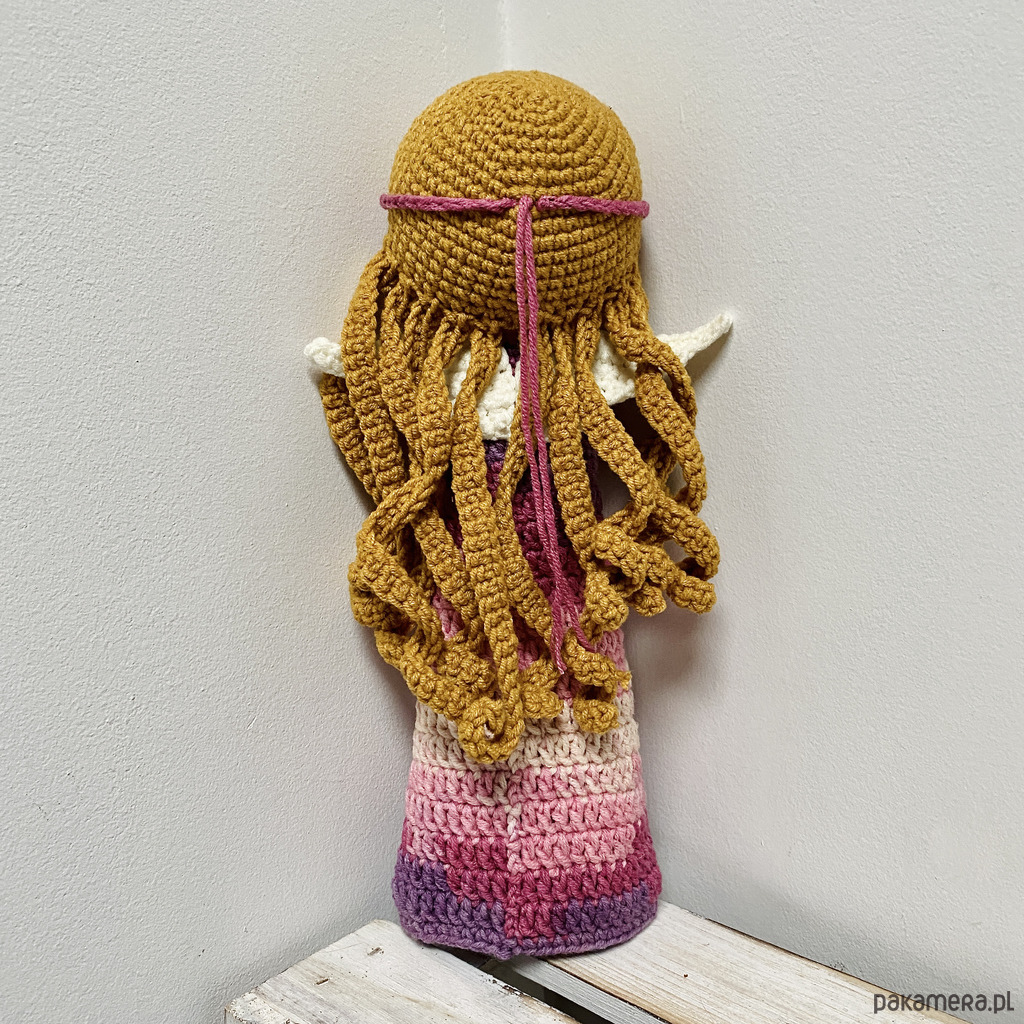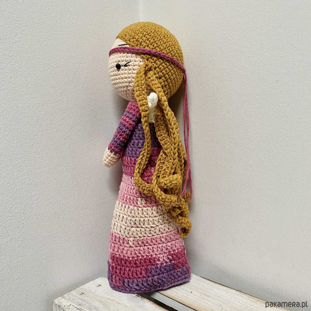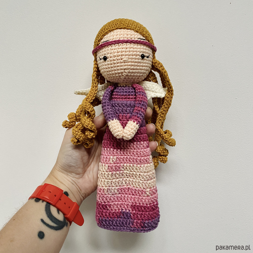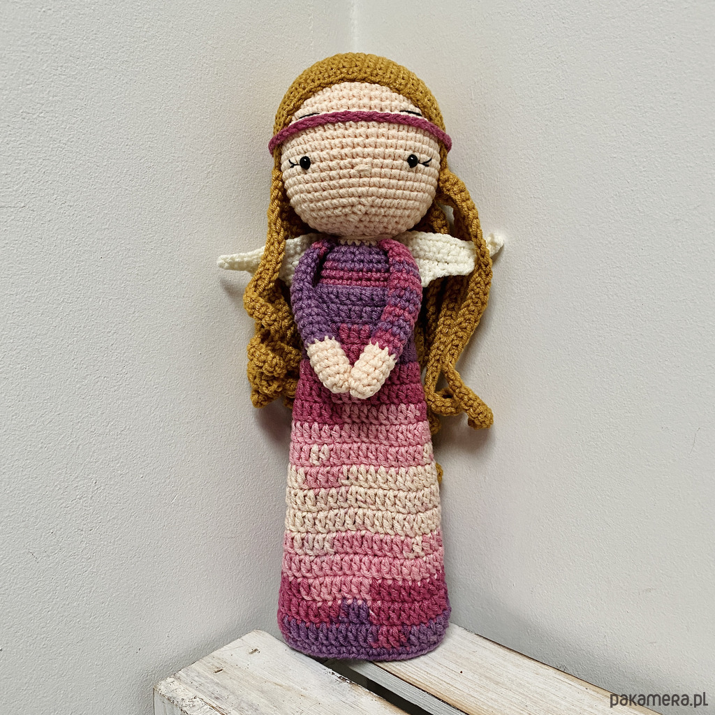 Anioł – lalka maskotka, wykonana ręcznie na szydełku z wysokiej jakości bawełny z poliakrylem, wypełniona antyalergicznym wkładem poduszkowym. Bezpieczne oczka.