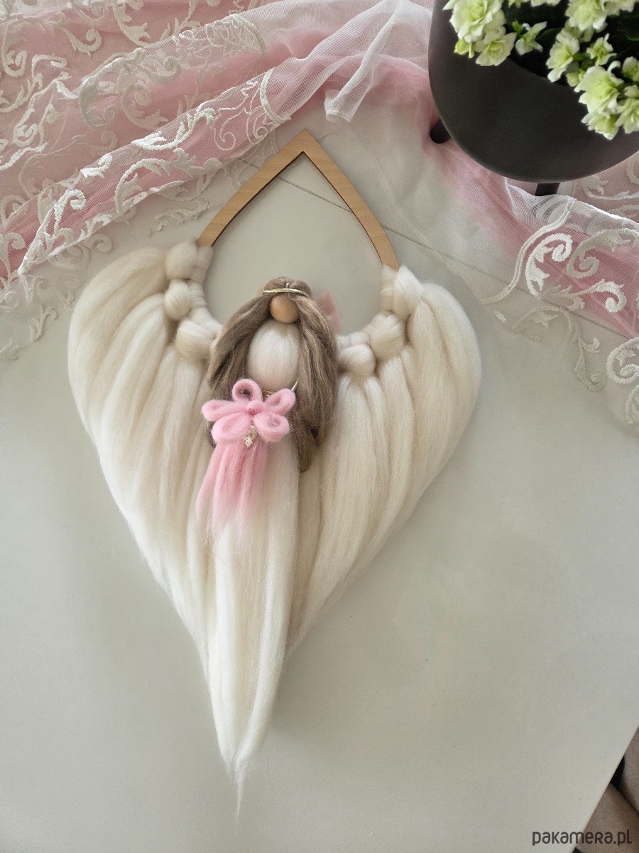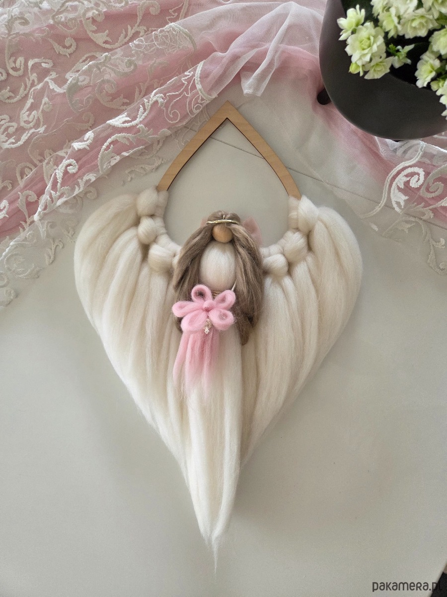 Anioł z wełny czesankowej w drewnianej obręczy serce – dekoracja ścienna handmade