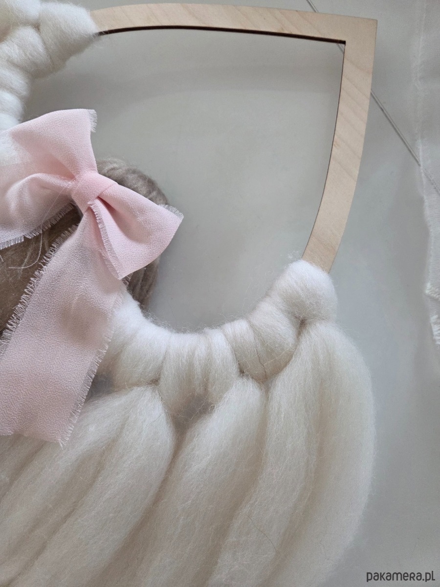 Ręcznie wykonany anioł z miękkiej, puszystej wełny czesankowej, umieszczony w drewnianej obręczy w kształcie serca. Naturalne materiały, subtelna forma i jasna kolorystyka sprawiają, że dekoracja wprowadza do wnętrza spokój, ciepło i przytulny klimat.