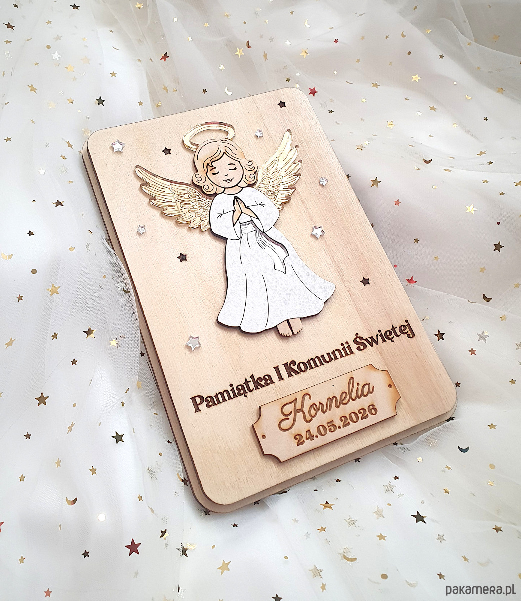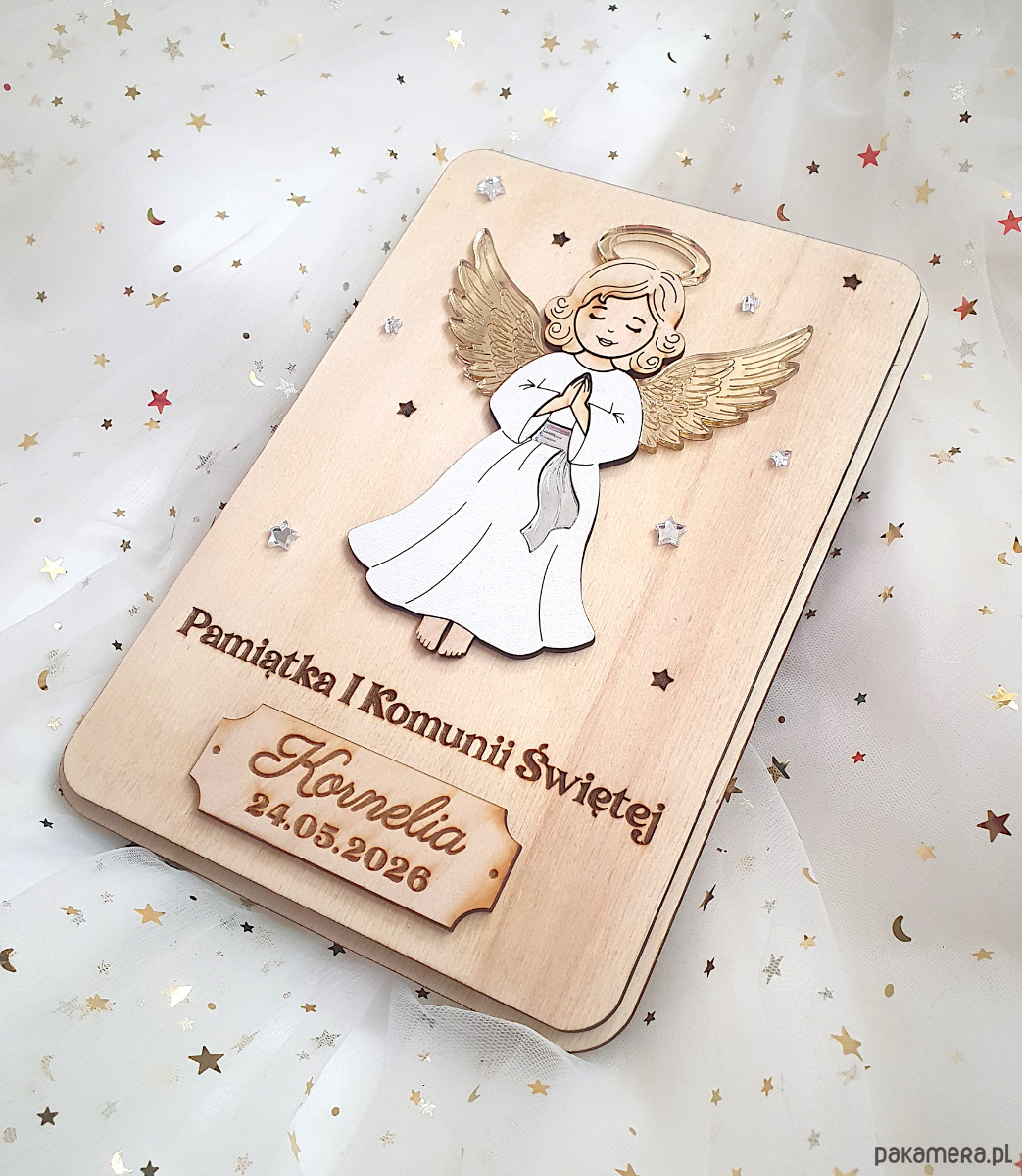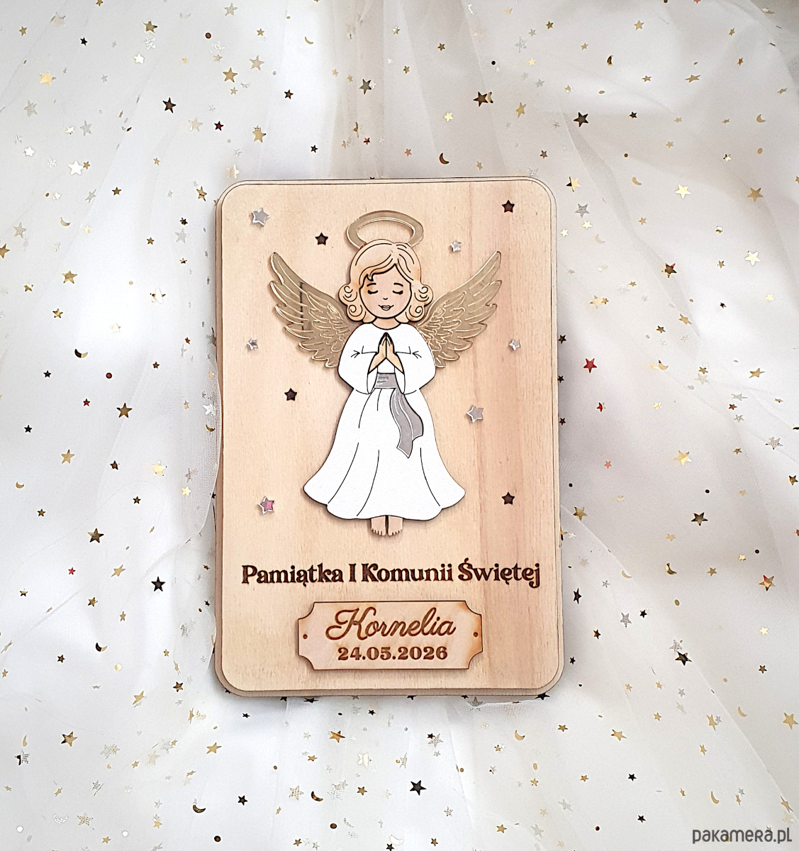Prezentuję aniołka- idealny prezent na I Komunię Świętą dla dziewczynki. Połączenie surowego drewna i lustrzanej plexi łączy w sobie ciepło i elegancję. Wymiary 17x25 cm, możliwość powieszenia na ścianie.