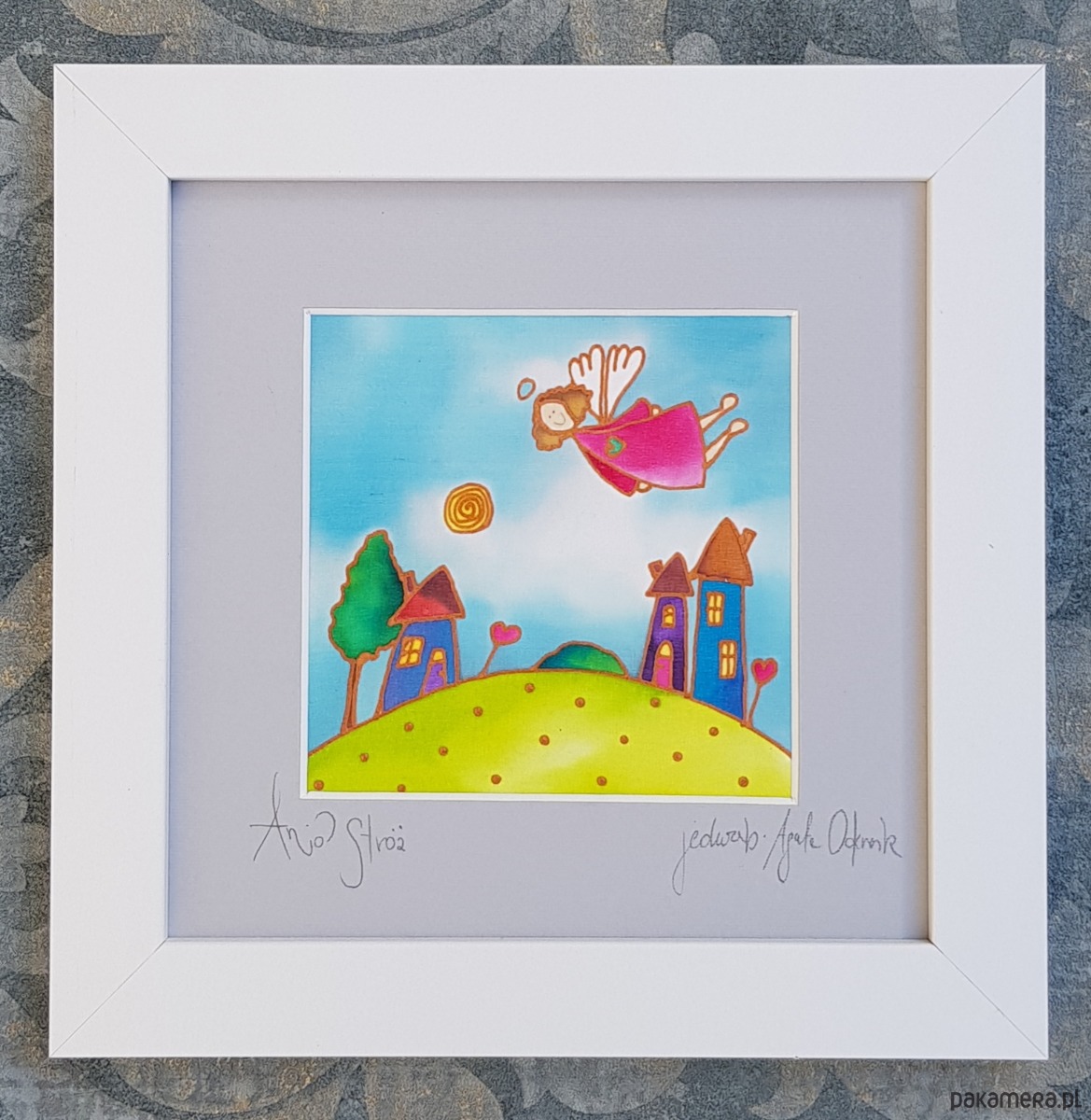 Namalowana na naturalnym jedwabiu, oprawiona w drewnianą białą ramkę 25x25 cm.