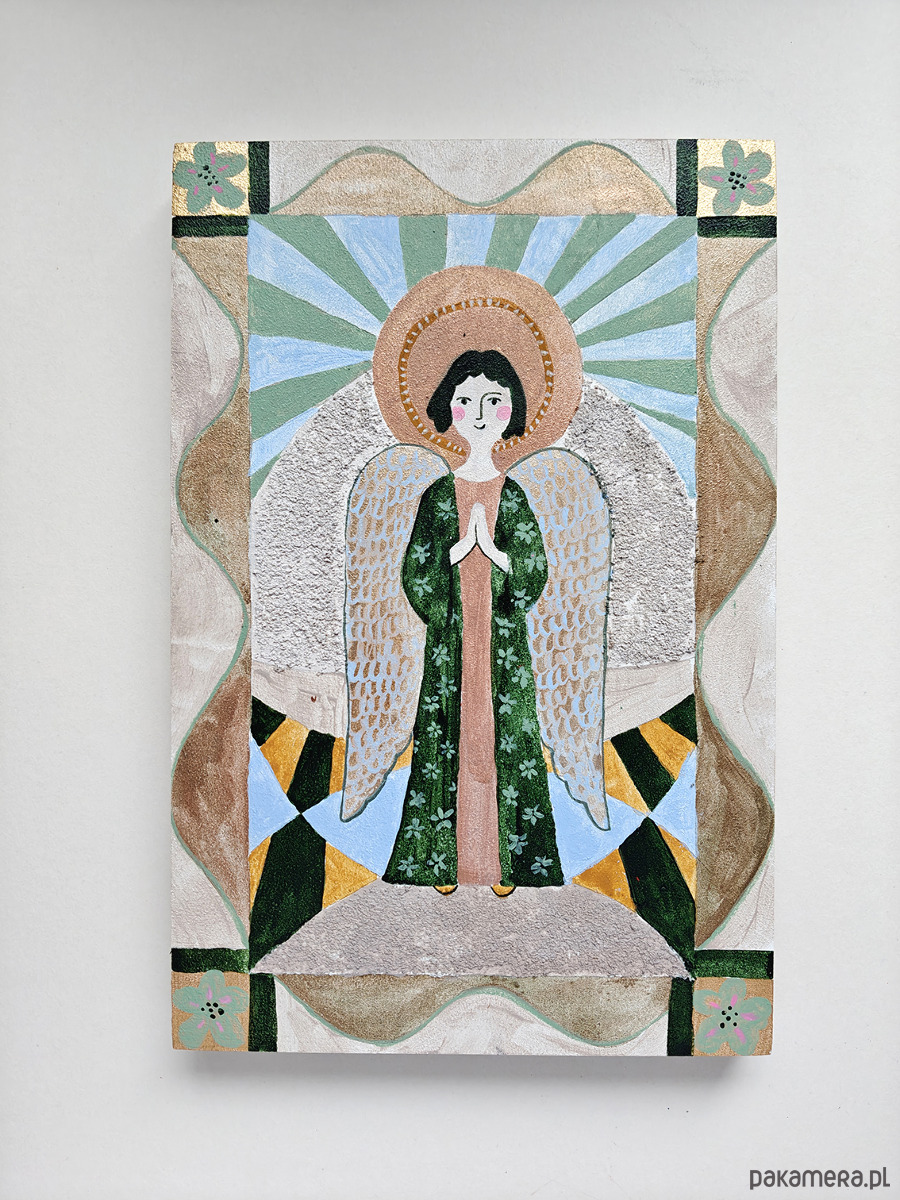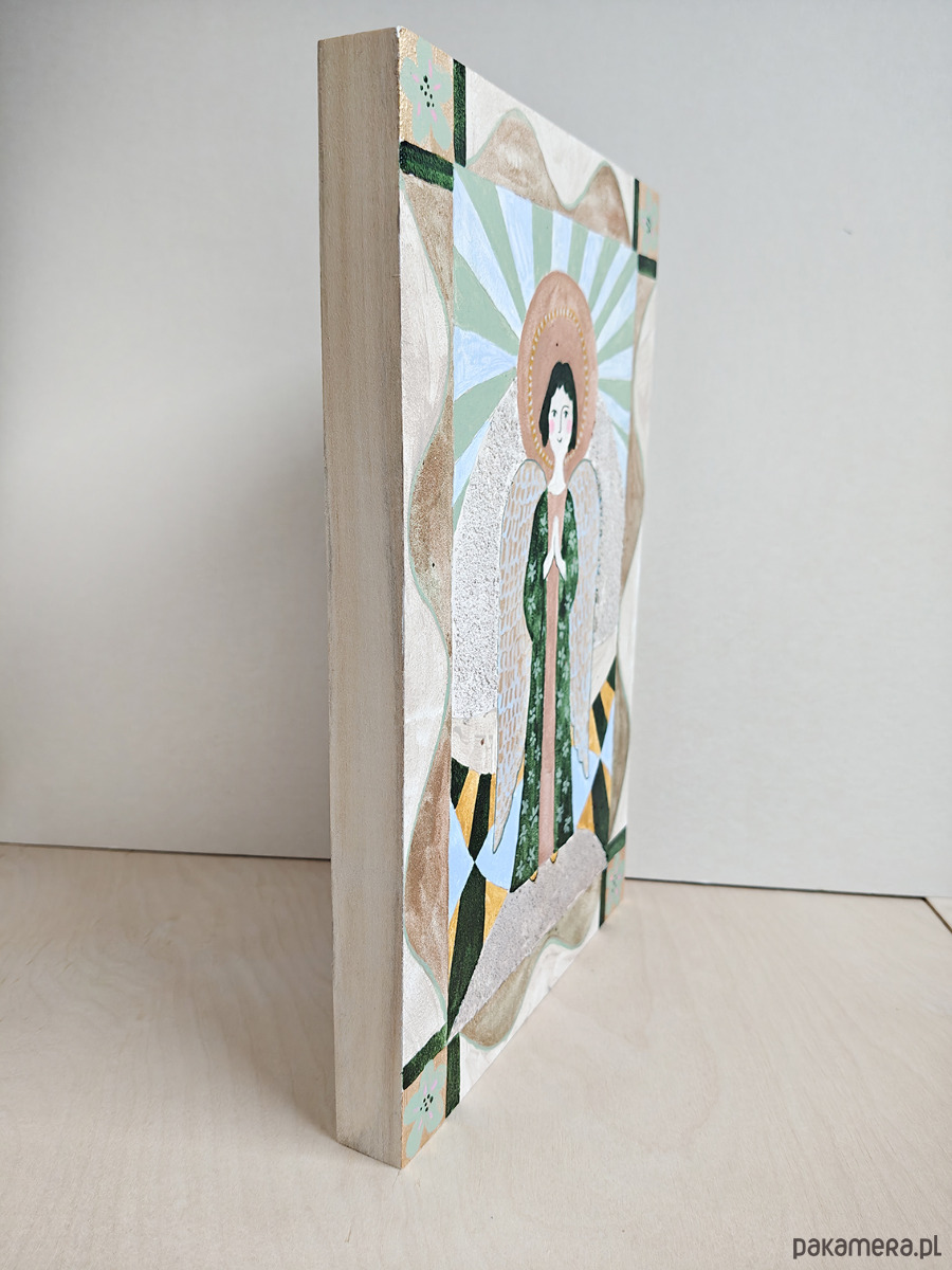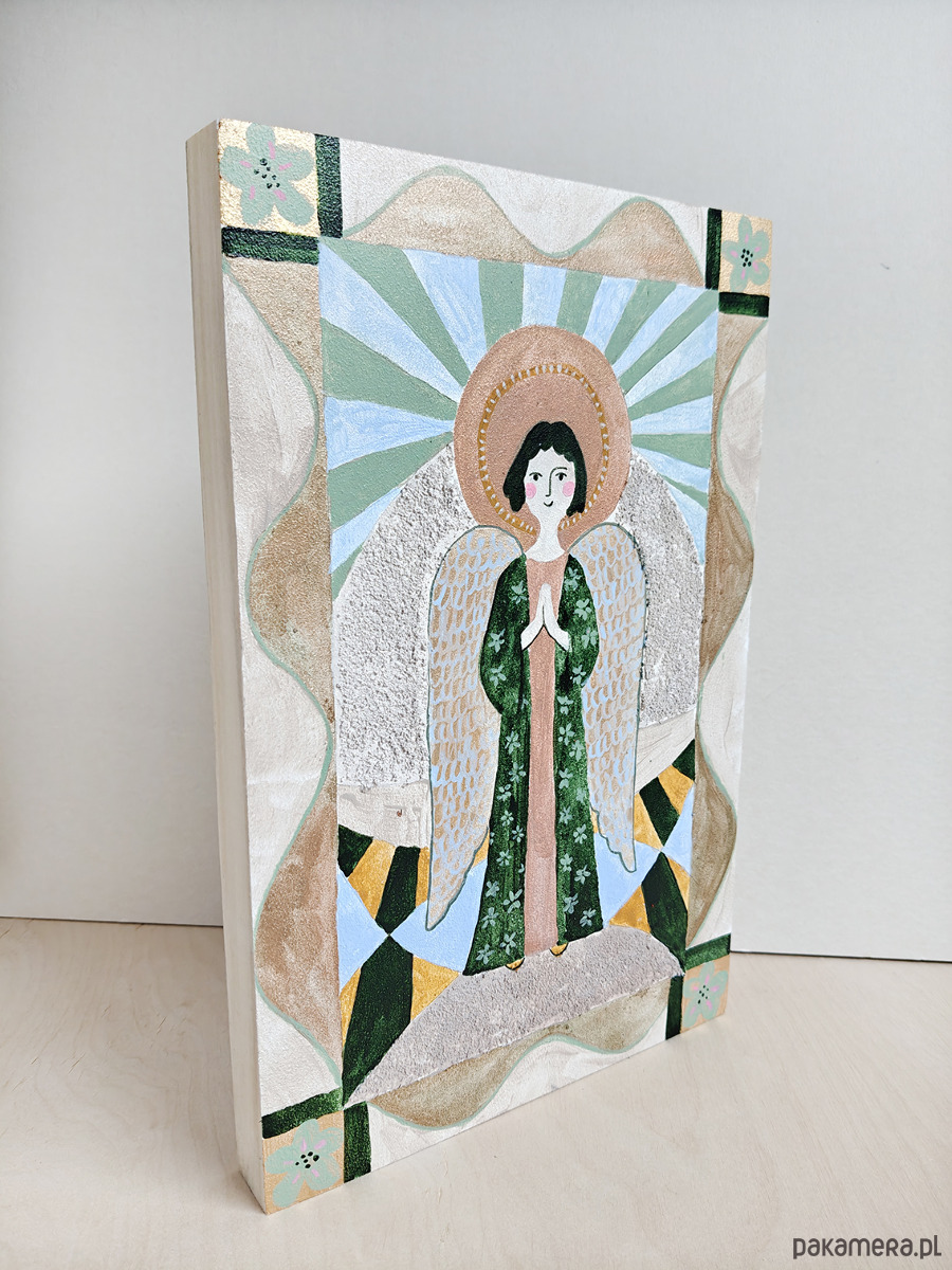 Ręcznie malowany anioł na drewnianej desce. Każdy egzemplarz jest unikatowy. Delikatna, symboliczna forma – idealna jako dekoracja wnętrza lub wyjątkowy prezent.