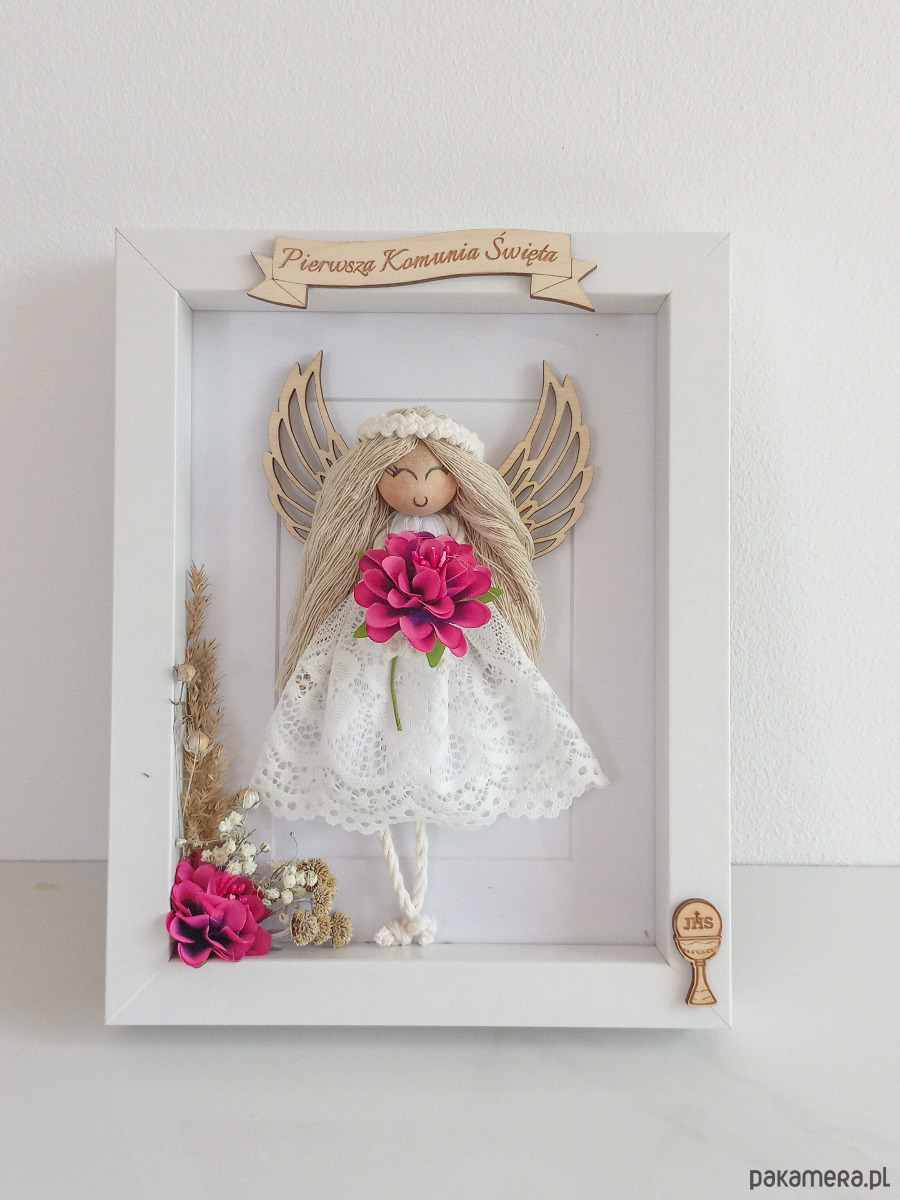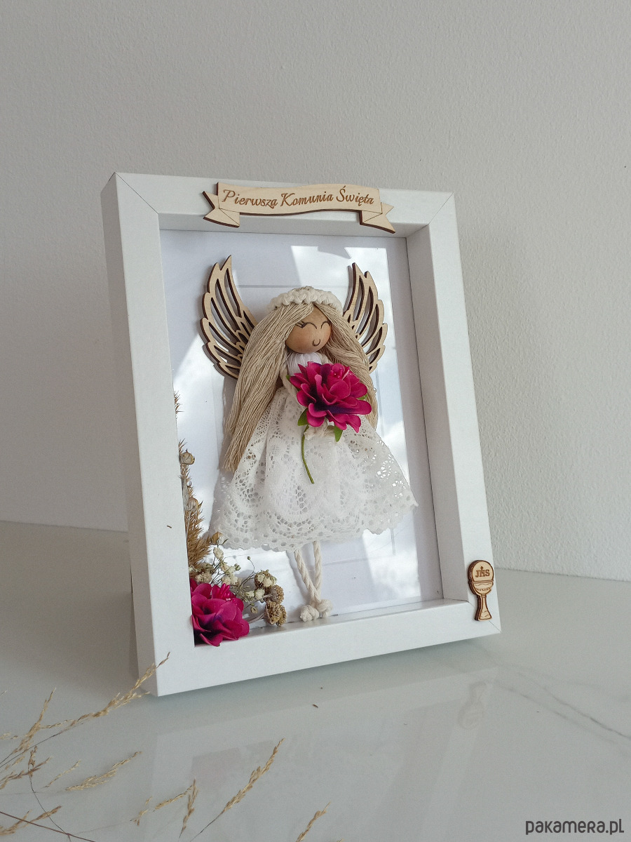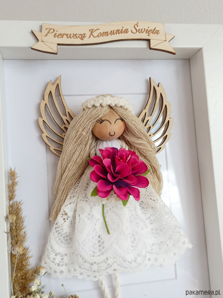Aniołek został starannie wykonany ze sznurka bawełnianego, ubrany w koronkową sukienkę. W rękach trzyma kwiat. Umieszczony w ramce wypełnionej suszonymi trawami i kwiatami. Dodatkowo na górze ramki znajduje się drewniana tabliczka z grawerem.